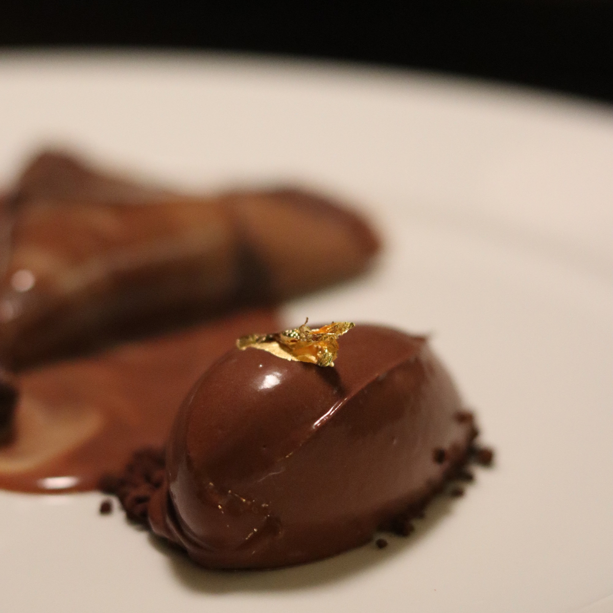 Nicht viele Menschen würden der Aussage „I love Chocolate “ widersprechen, und wenn doch, ist dies der Moment in dem sich Ihre Meinung ändern wird: Die Nachspeise ist ein Traum aus Schokolade. Auf der Zunge zergehende Crêpes aus Schokolade, gefüllt mit Schokolade und übergossen mit wunderbar marmorierter, geschmolzener Schokolade. Dazu eine Creme aus – na, was wohl – Schokolade, die feiner und leichter nicht sein könnte. Alles gekrönt von ein wenig Blattgold.