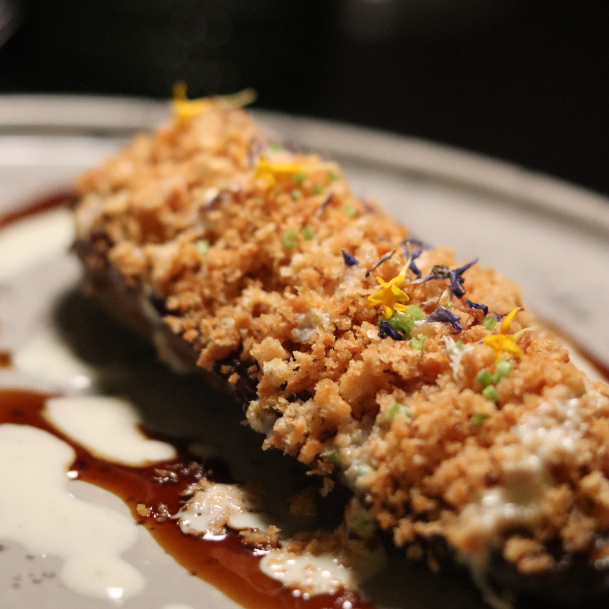 Knusprige Aubergine | Seidentofu | Kaffir Limette | Shi i take | Korianderstiel