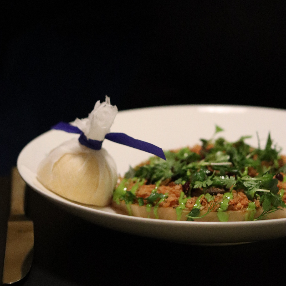 Gutes Brot ist mein persönlicher Schwachpunkt. Außen knusprig, innen weich und voller Geschmack – ein Traum für jeden Foodie. Sie können sich also meine Begeisterung vorstellen, als uns ein ebensolches Exemplar mit cremiger Butter serviert wird. Es folgt der erste Gang in Form eines vegetarischen Tatars. Wie das klassische Tartar wird auch das „Vatar Heritage“ mit Ei serviert. Kapern, Jackfruit und fermentierte Senfsaat geben dem „Vatar“ einen einzigartigen und vor allem intensiven Geschmack.