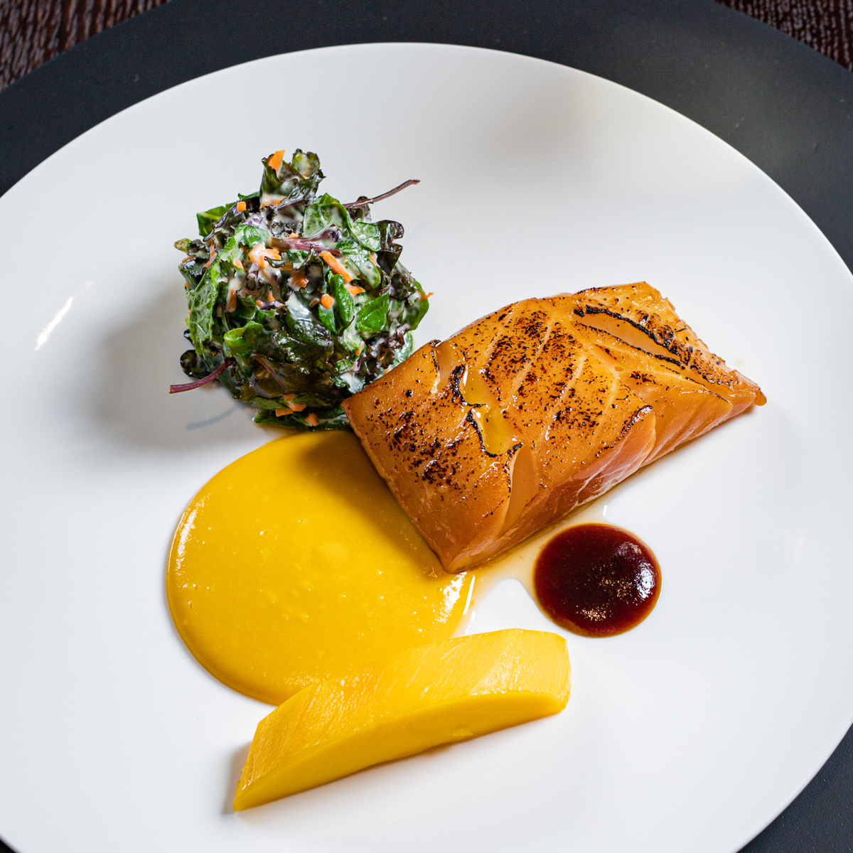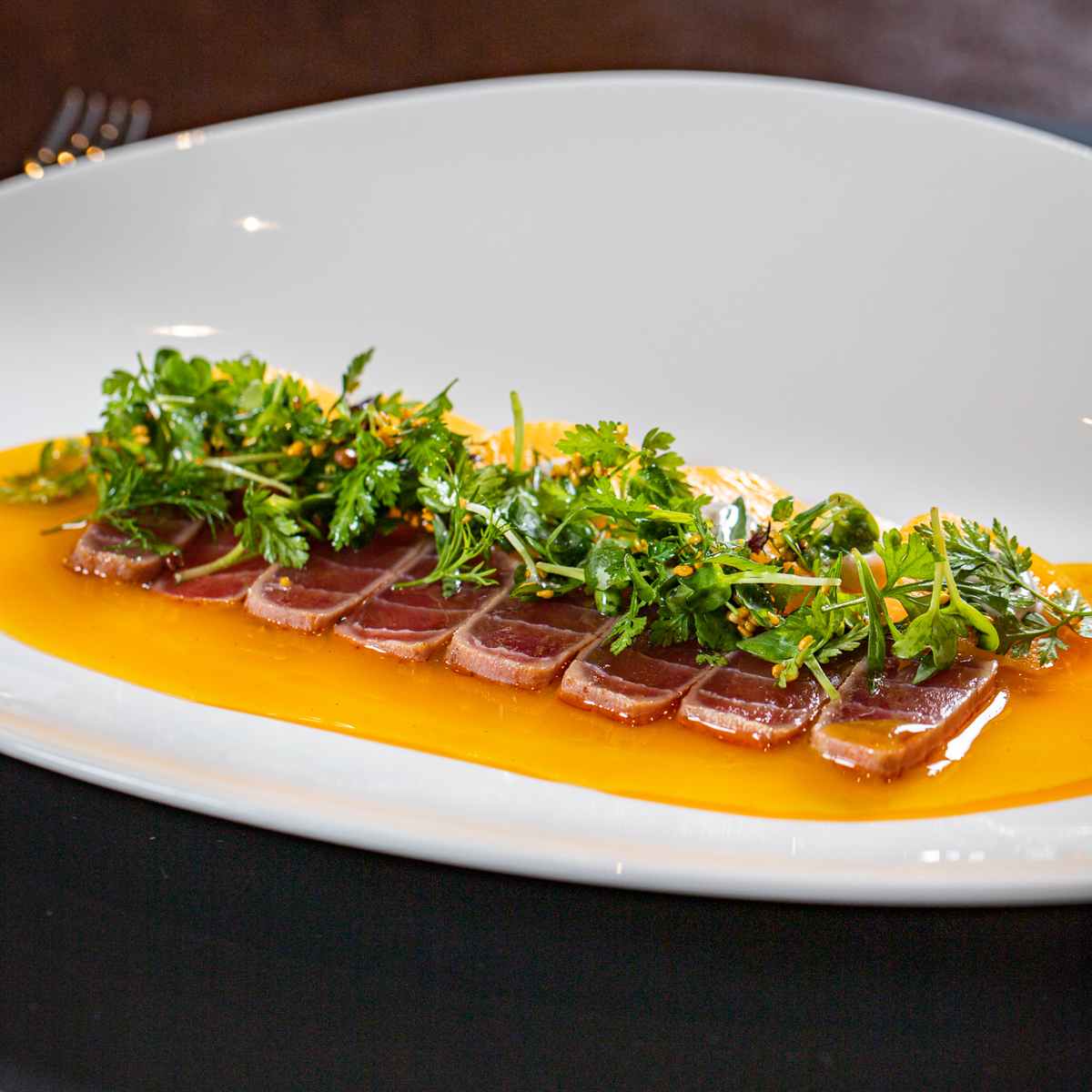 Für diese reichen unsere Kapazitäten am heutigen Abend leider nicht aus, daher begnügen wir uns mit einer Selektion aus der Karte. Da wir Lust auf etwas Leichtes haben, wählen wir die Fischteller. Mich erwartet ein hübsch angerichtetes Tataki, kurz scharf angebratener, aber im Kern roher Thunfisch, mit Kürbis-Dashi und Trüffelcreme. Sehr fein, ebenso wie der Lachs mit Grapefruit, Sesam und Miso meiner Begleitung.