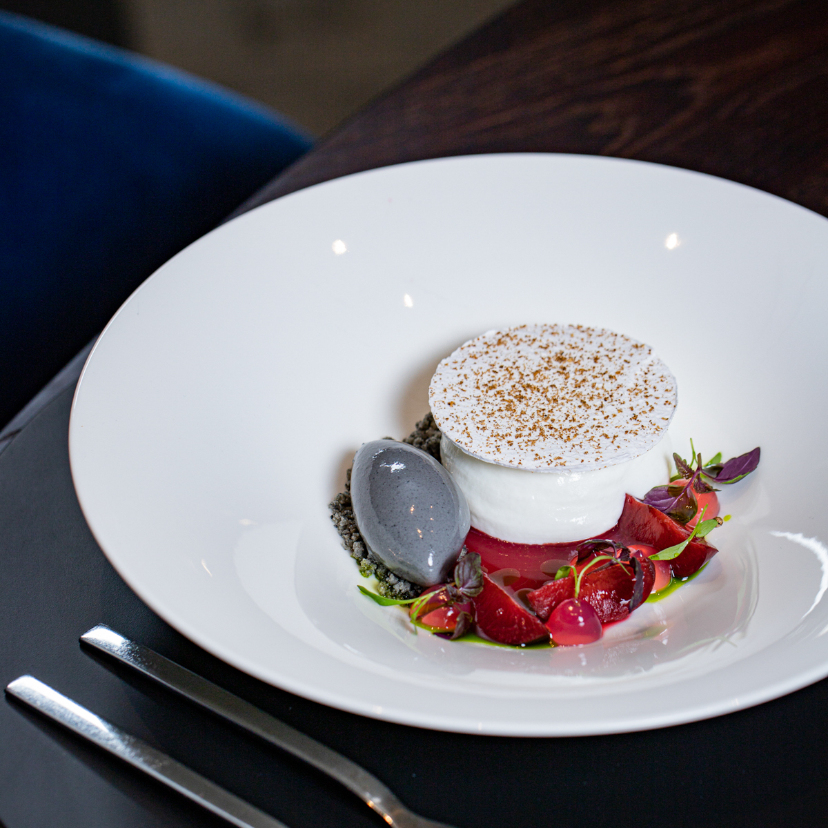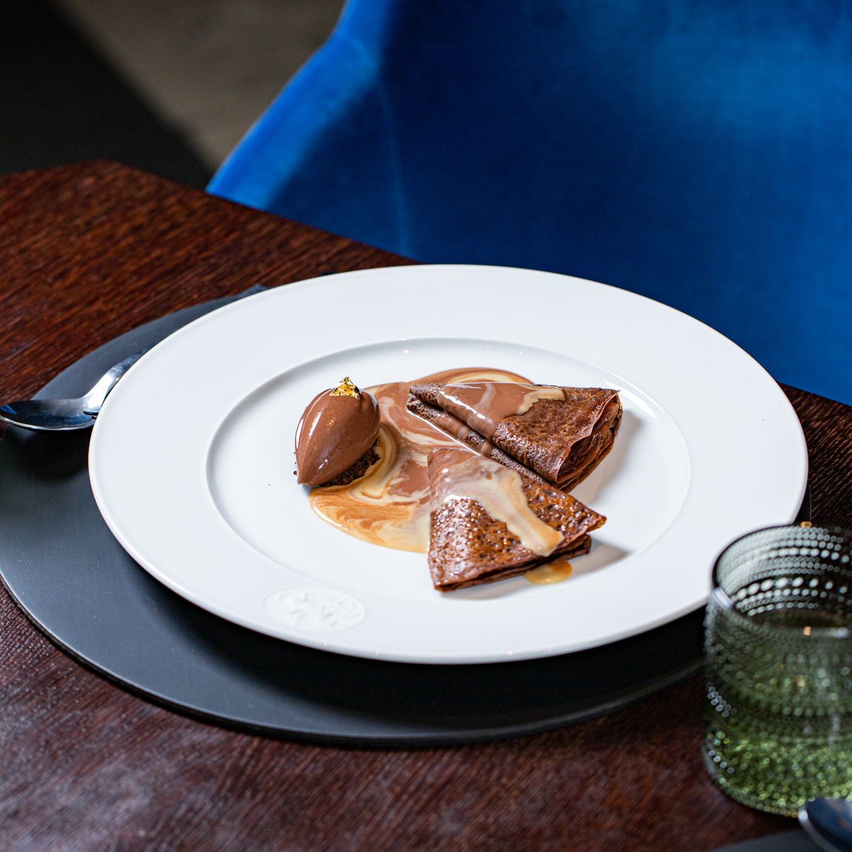 Das passt zum Motto des Heritage, Neues im Altbekannten zu finden und einen Ort, an dem man sich gerne aufhält zu kreieren. Die Atmosphäre ist ruhig, die preußischen Blautöne in Kombination mit warmen Holz- und Kupferelementen bilden ein entschleunigendes Restauranterlebnis, in dem auch die Auswahl an Speisen zur Ungezwungenheit einlädt und ebenso wie das Interieur Pracht und Moderne vereint.