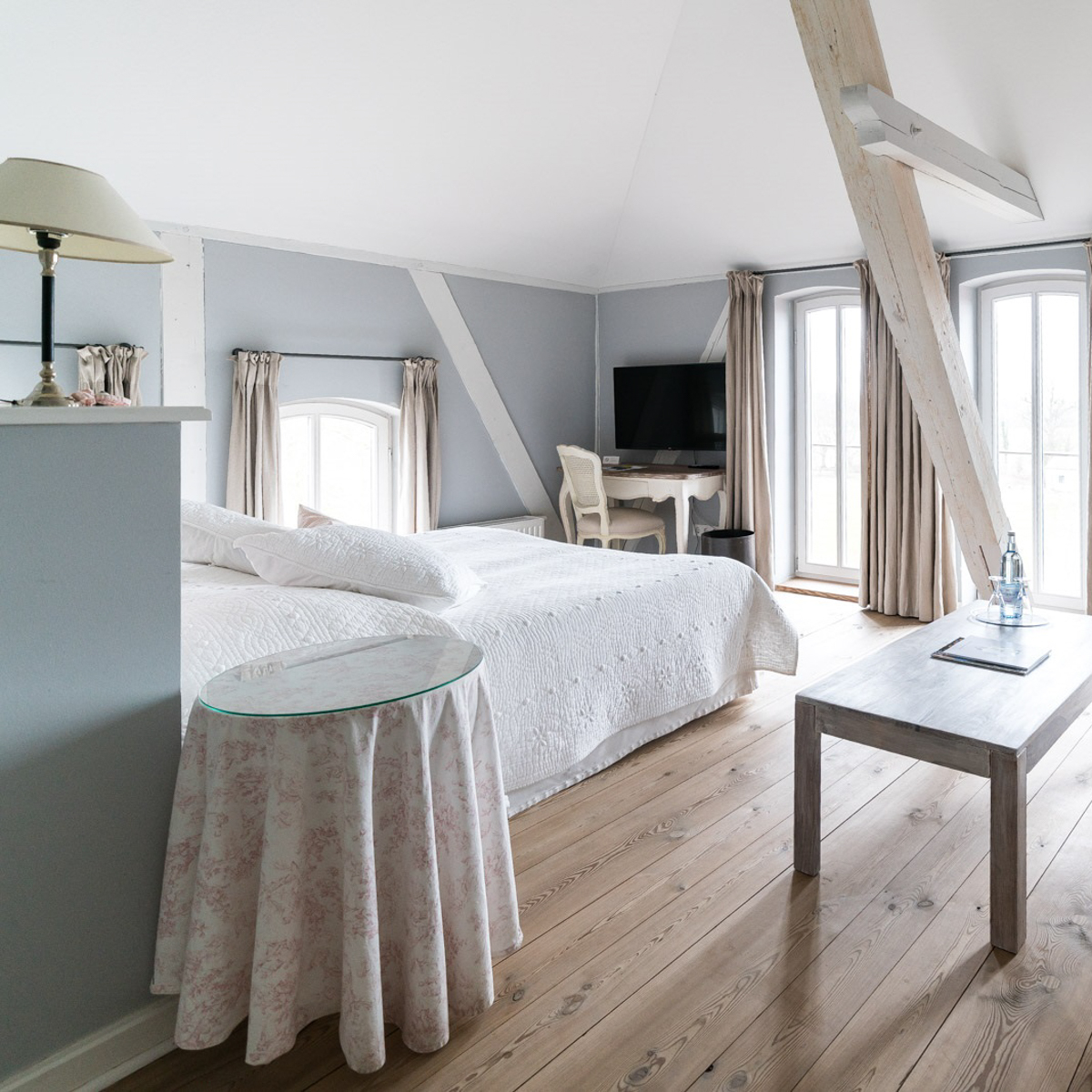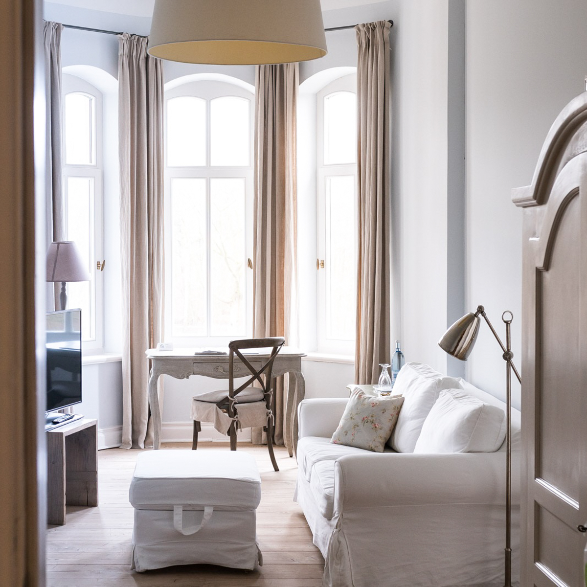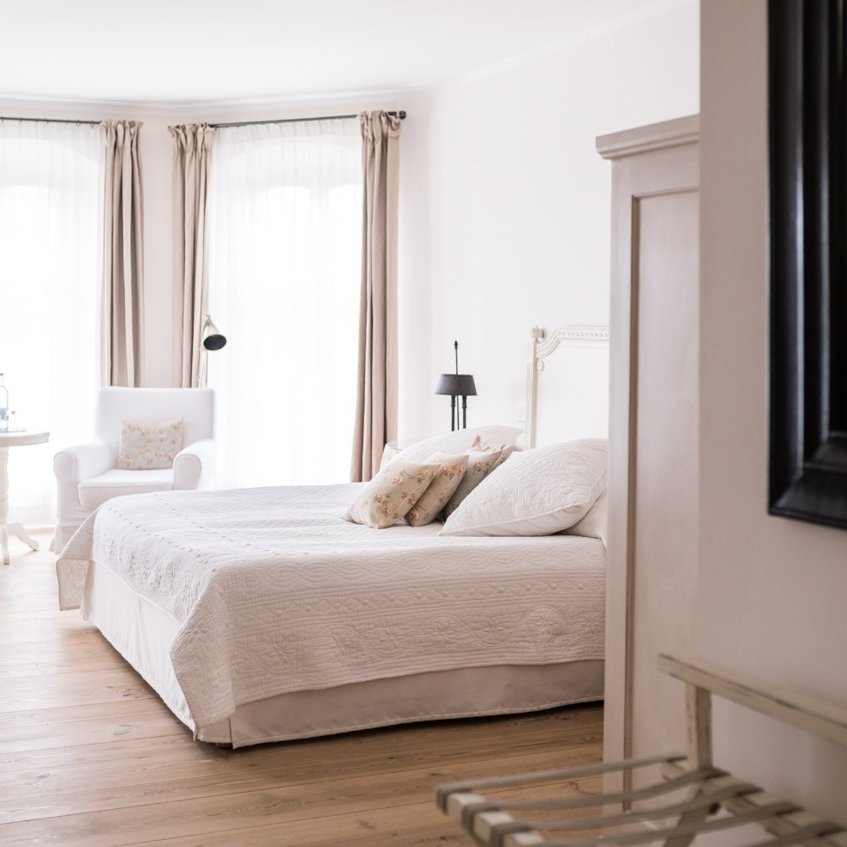 Neunzehn Zimmer und Suiten, jedes individuell gestaltet, laden zum Verweilen ein. Helle Stoffe, antike Möbel, maßgefertigte Details – nichts wirkt standardisiert, alles persönlich. Die großzügigen Bäder mit Wasserfallduschen, feine Bettwäsche und der Blick in den Park machen Schloss Gamehl zu einem echten Wohlfühlort.