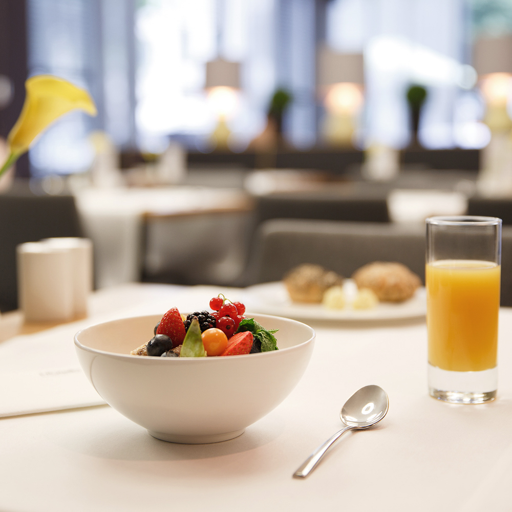 Auch vom Frühstücksraum aus blickt man teils hinüber in das bunte Treiben nebenan, teils verströmen hier erneut dezente Grau und Anthrazit-Töne eine angenehm ruhige Atmosphäre. Das Buffet bietet von frischen Säften über alle erdenklichen Brotsorten und süßem Gebäck bis hin zu Aufschnitt, Quarkspeisen, Omelette und Müslisorten alles, was man sich von einem ordentlichen Frühstück erwartet.