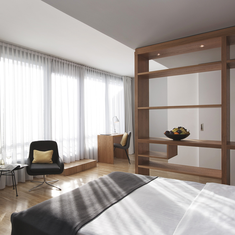 Die trendige und zugleich extrem wohnliche Gestaltung setzt sich in den Zimmern fort: In meinem Business Zimmer erwartet mich ein sagenhaft bequemes Kingsize-Bett, gerahmt von schicken Gubi Design-Leuchten. Mein Laptop findet genügend Platz auf dem kleinen Wandtisch und das moderne Bad bietet zu meiner großen Freude auch langarmigen Menschen wie mir mehr als genug Bewegungsfreiheit.