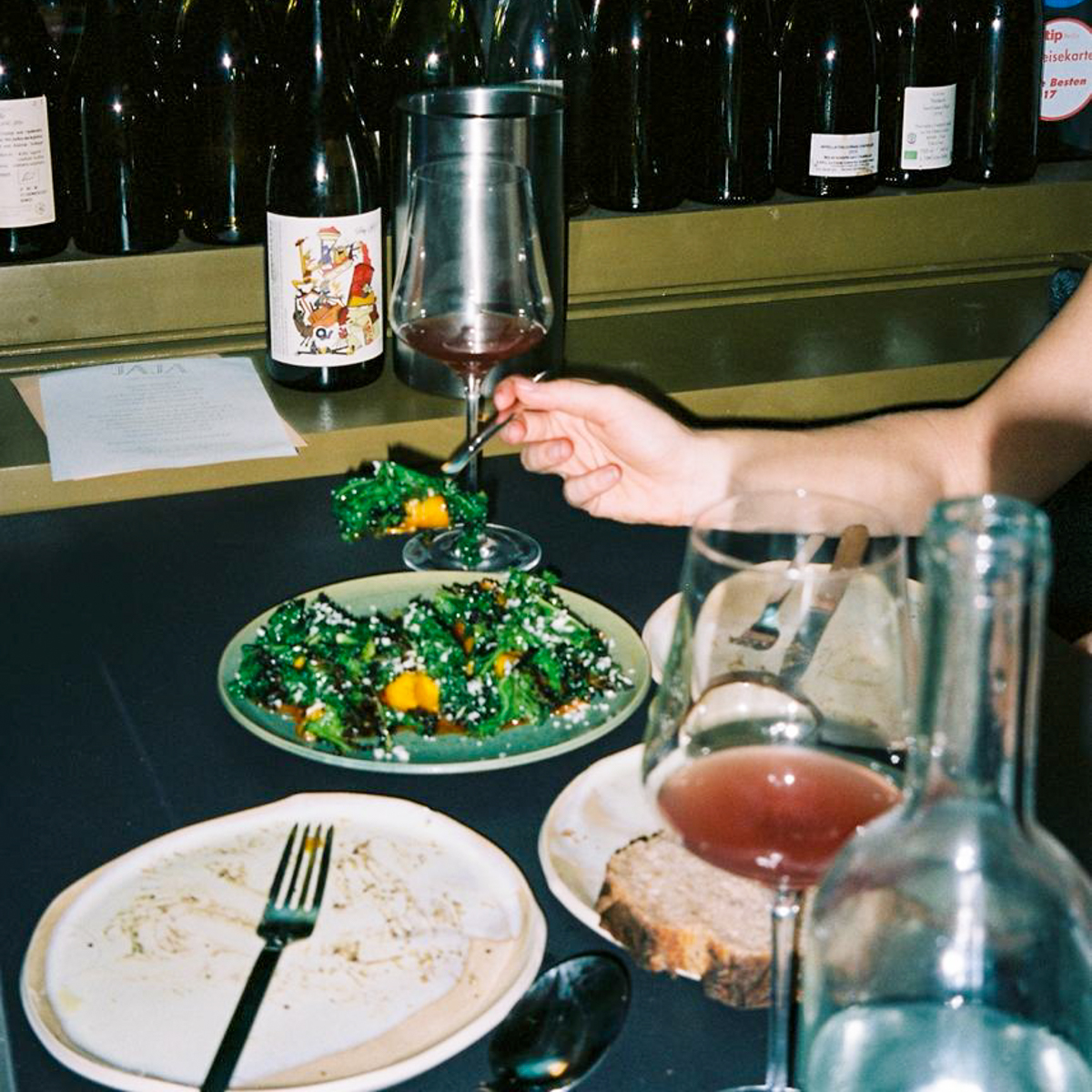 Nachdem die Gründer*innen Julia und Sven sich in der Coronazeit umorientiert und den Weinladen Return of the Living Wine gegründet haben, haben Hannes und seine Freundin Claude das JAJA übernommen. Hannes, eigentlich Künstler, hatte irgendwann genug von der Kunstwelt und fing an, in Restaurants zu arbeiten. Eine Zeit lang in Kopenhagen, im Amass und im Relais, später in Berlin schließlich bei Lode & Stijn.