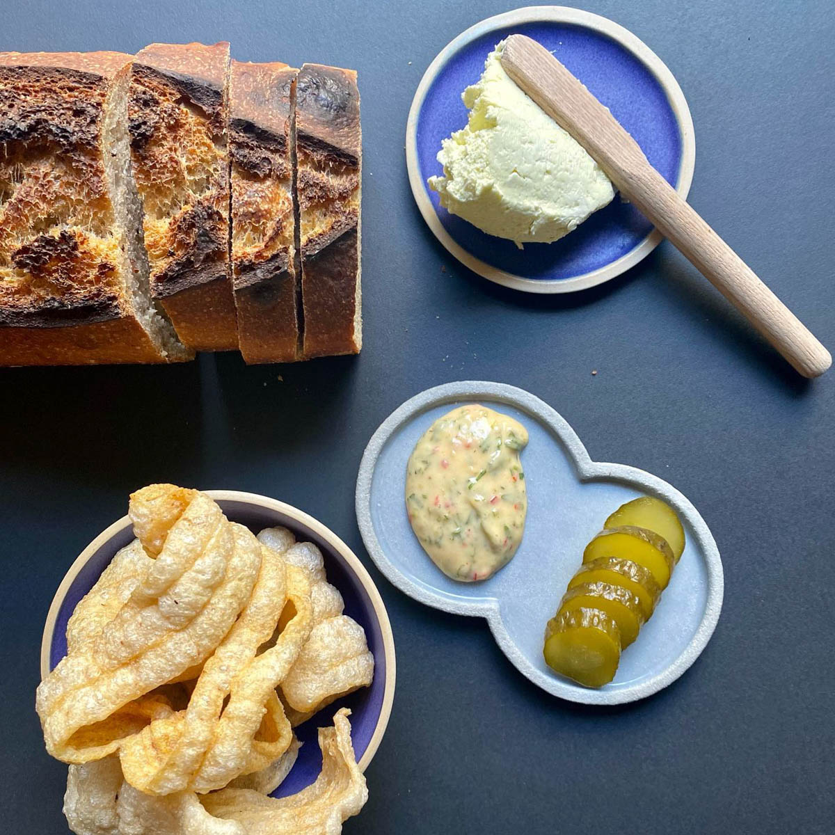 Wir beginnen unseren Abend, der von einem abgestimmten Winepairing begleitet wird, mit einer Zusammenstellung der Vorspeisen. Rustikal, aber dafür umso passender zum Naturwein kommen sie daher. Es gibt ein fluffiges Sauerteigbrot mit Butter, sowie eine kleine Käseauswahl mit kandierter Zitrone und dazu Lavendelmandeln.