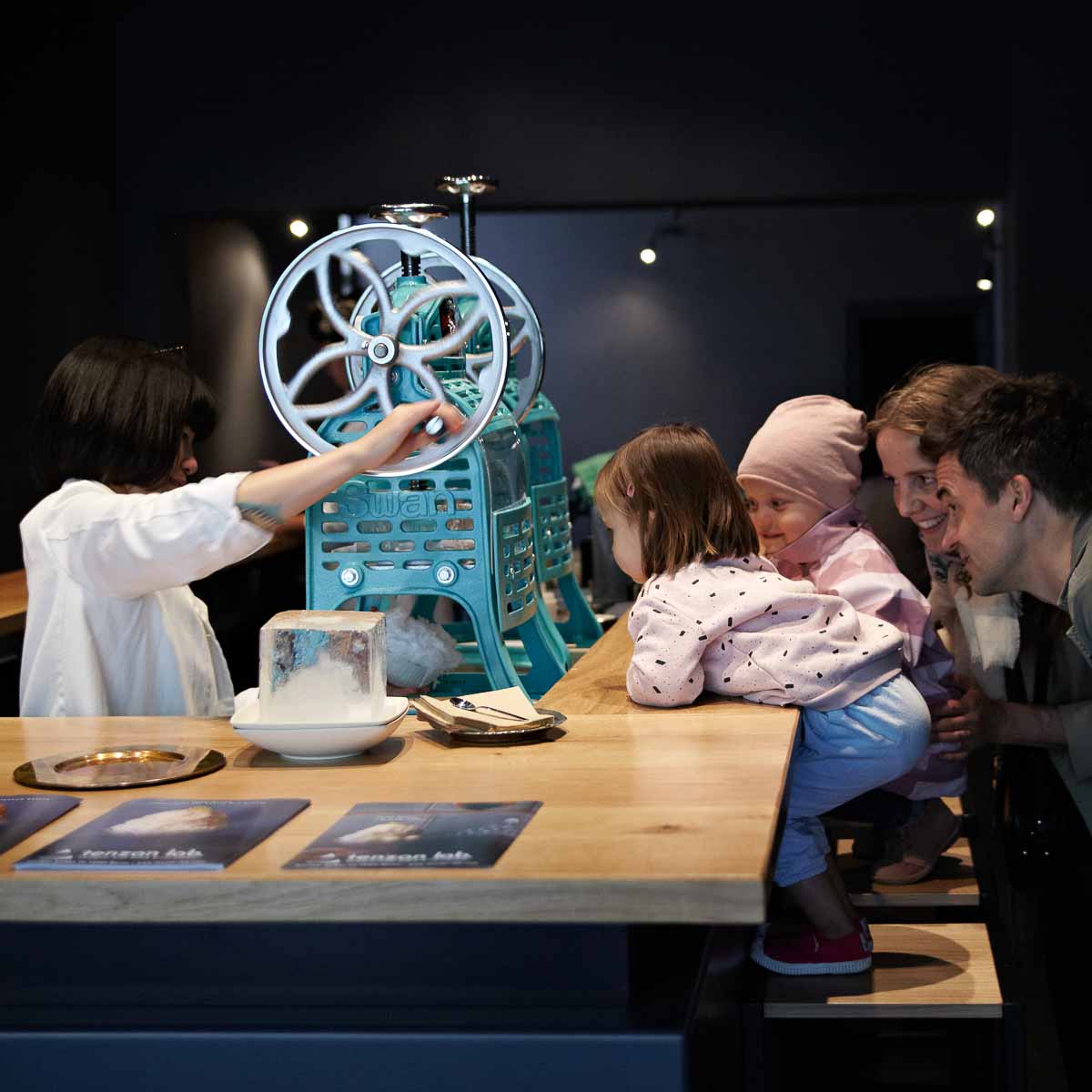 Dafür gefriert japanisches Wasser rund vier Tage bei Temperaturen von knapp unter null Grad langsam und in kontinuierlicher Bewegung, um überflüssige Luft aus dem eiskalten Vergnügen herauszupressen. Im nächsten Schritt geht es im Tenzan Lab ans "Shaven". Jede einzelne Bestellung wird frisch von Hand zubereitet und so wird auch der Eisblock händisch mit Hilfe einer speziellen türkisblauen Schabemaschine zu etwa acht großen fluffigen Kakigōris geformt.