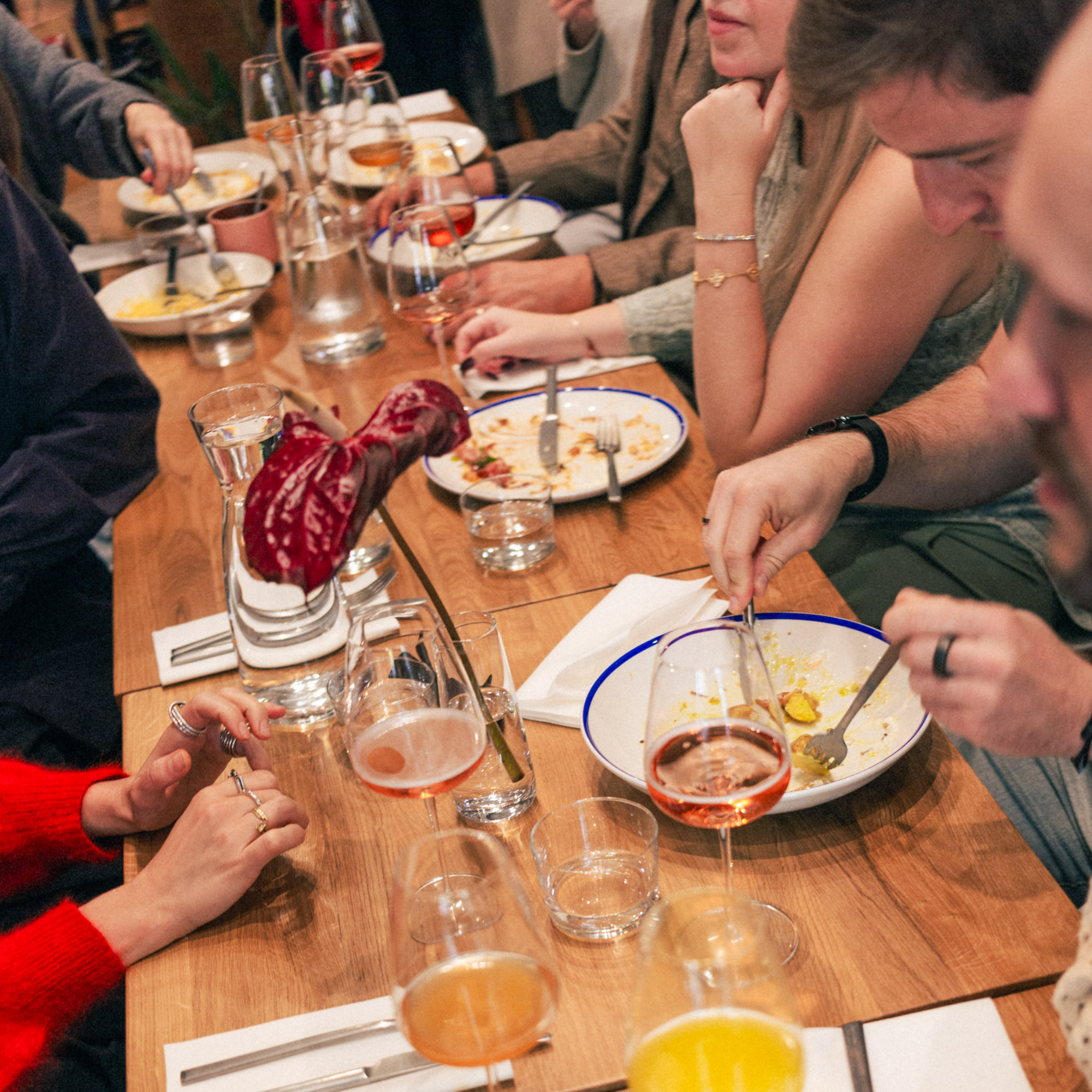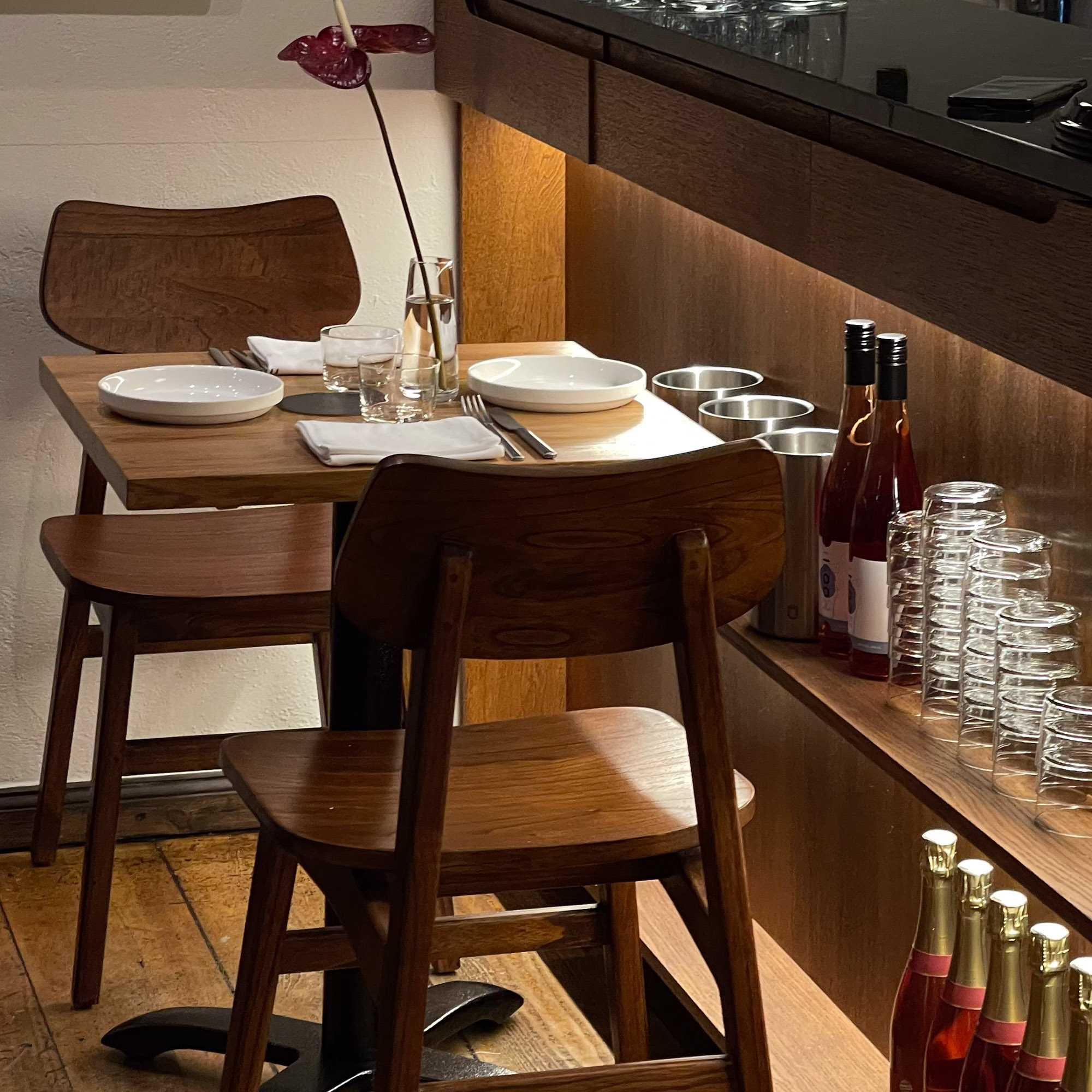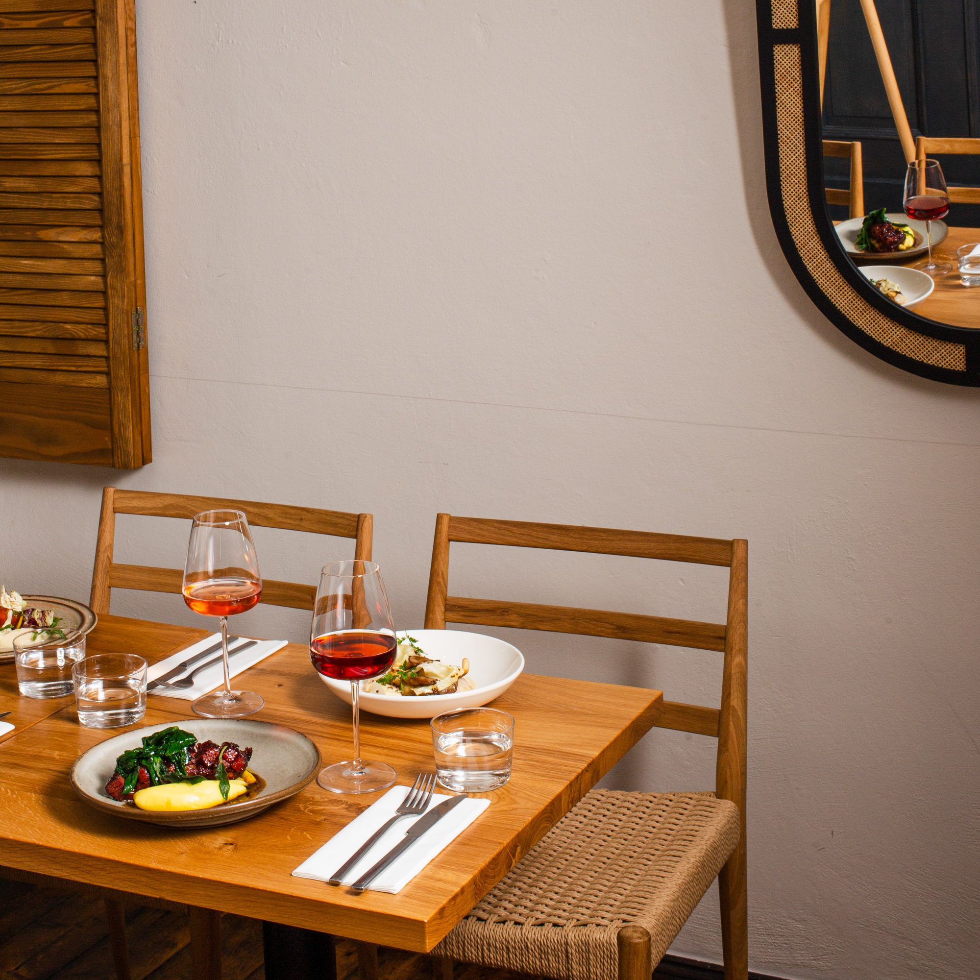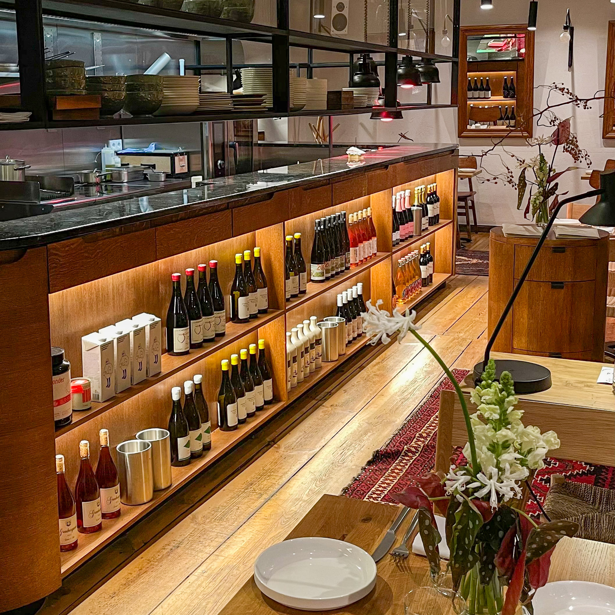 Zieht man bei aufkommender abendlicher Kühle dann ins Innere des Restaurants, empfängt einen das eklektische Interieur, das eine elegante Gemütlichkeit ausstrahlt: warmes Licht, viel Holz, ein paar Perserteppiche treffen auf Japanidi-Mobiliar. Der Gast und sein jeweiliges Bedürfnis stehen hier im Mittelpunkt – ob Frühstück nach dem Yoga bei Poké Bowl und frischem Grapefruitsaft, Matcha Mango Coconut und Udon Nudeln à la Cacio Pepe zum Lunch mit der Bestie.