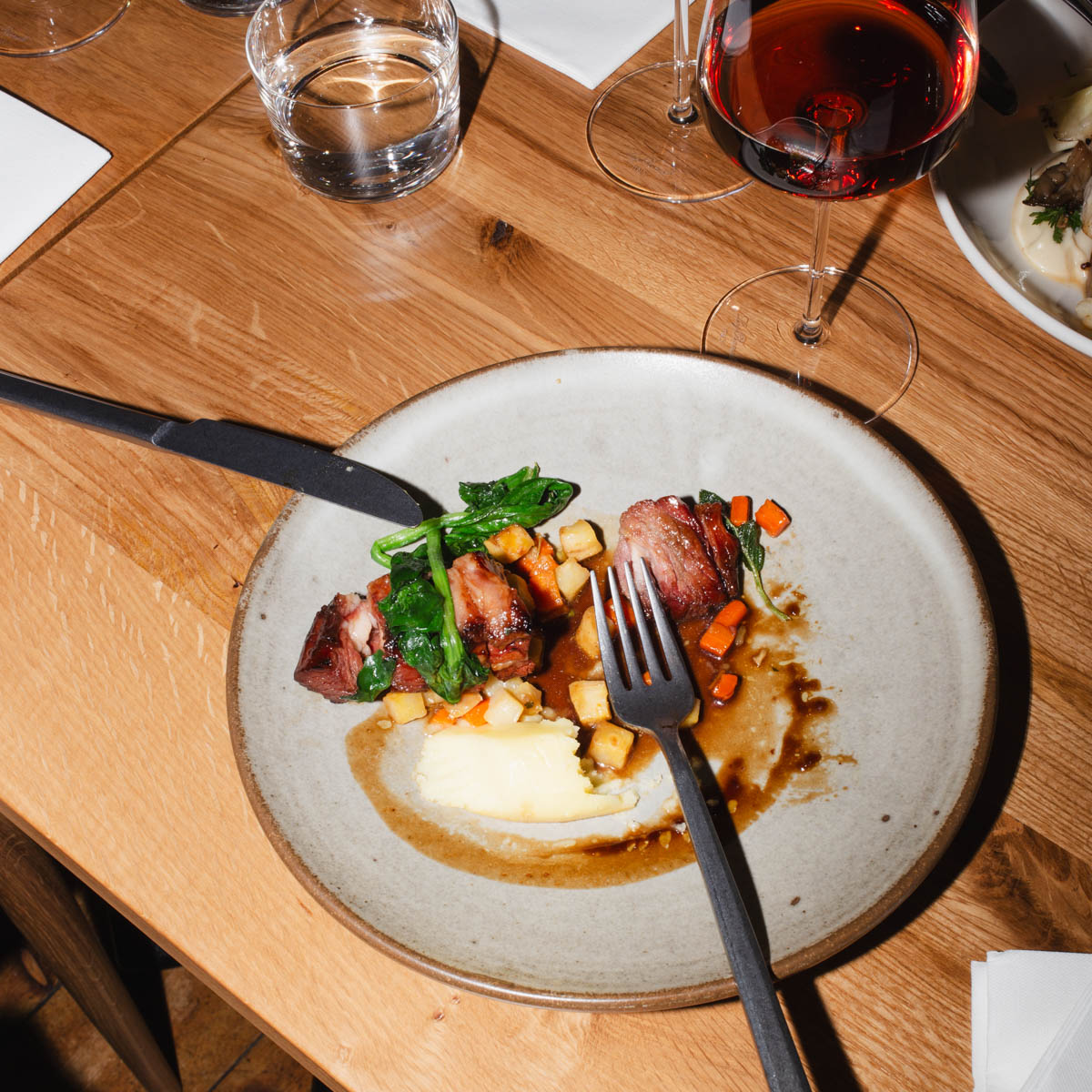 Mit ihnen teilt man gern das sizilianisch angemachte Fisch Crudo aus Thunfisch, Lachs und Hamachi mit Kapern. Die Trüffelpasta, den gebratenen Heilbutt auf gemischtem Gemüse mit geräucherter Tomatensauce oder das Dry-aged Beef Rib mit Spinat und einem herrlich buttrig-cremigem Salbei-Kartoffelpüree müssen aber natürlich nicht zwingend geteilt werden. Ganz wie es beliebt.
