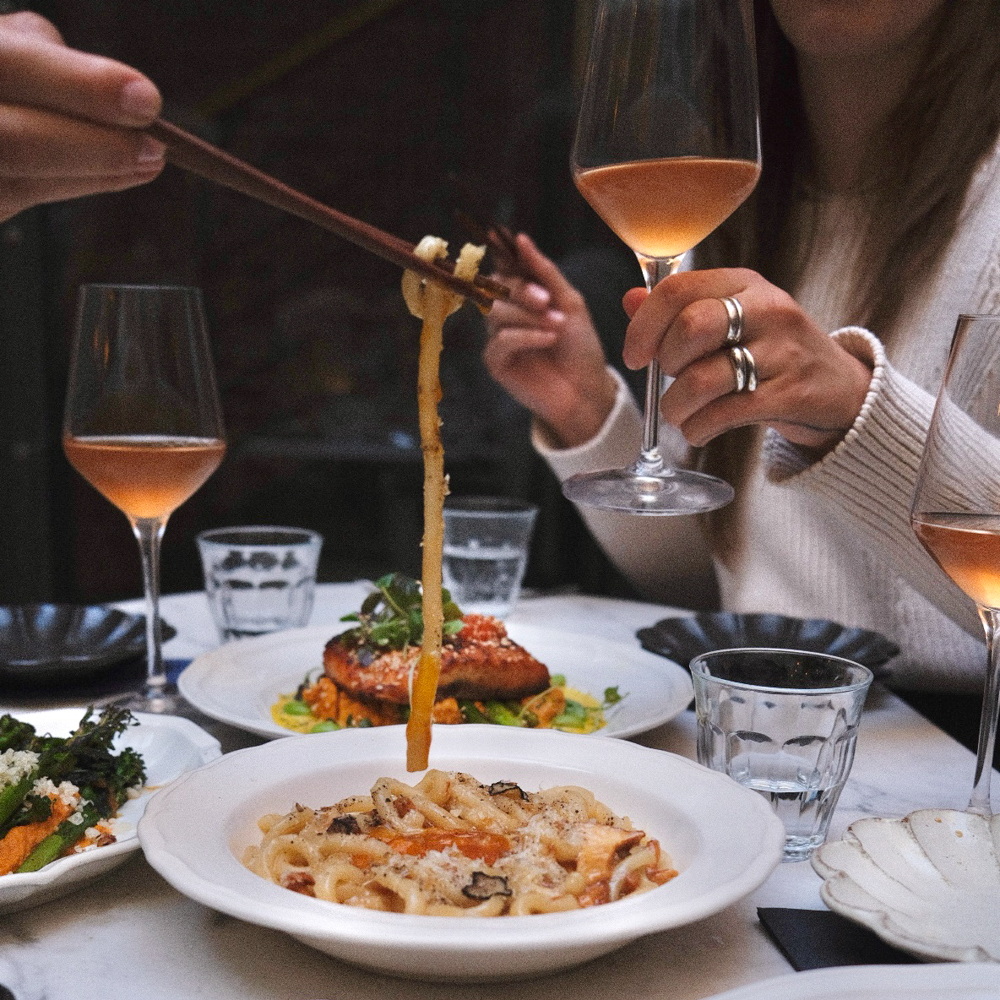 Die Udon-Nudeln von „Cacio e Kinoko“ sind, wie man sie erwartet, dick und schlotzig. Die Misobutter dazu ist eher mild, passt aber perfekt zu dem wachsweichen Eigelb und den „cacio e pepe“-Aromen. Dieser Gang ist Soulfood pur! Unter den Erwartungen bleiben lediglich die beiden Desserts, die wir noch probieren. Aber so kurz nach der Eröffnung darf ja noch Luft nach oben sein.