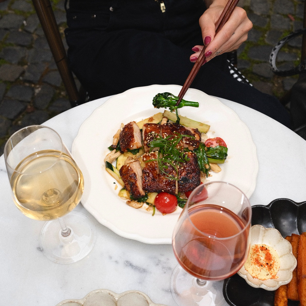 Wir starten mit „Spicy Gyoza“ – Dumplings aus Reismehl, gefüllt mit Garnelen, serviert in würziger Soja-Chili-Marinade, frischem Koriander und Frühlingszwiebeln. Das Französische findet sich höchstens in der Art, wie die Vorspeise serviert wird, geschmacklich überzeugt sie dennoch voll und ganz. Wein bestellen wir zur Mittagszeit nicht, die Auswahl an französischen und deutschen Winzern klingt allerdings spannend.