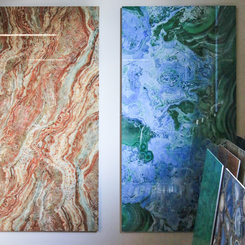 Dazu zählt auch das Spachteln von Wänden und Möbeln mit Sichtbeton, Metallspachtel oder anderen aufwendigen Verfahren. Es gibt Glasfliesen, auf die jedes beliebige Motiv aufgebracht werden kann, blumige Mosaike und duzende anderer Wand- und Bodenbeläge, von denen ich noch nie etwas gehört habe. Am Ende weist Siegfried Nolting noch auf einen weiteren Aufsteller: „Wissen Sie was das ist? – Das ist hauchdünner Schiefer, der mit Hilfe eines Verfahrens aus der Archäologie mit Harz aufgenommen und abgerissen wurde, um die dünnen Schichten andernorts auf die Wand bringen zu können." – Irre!