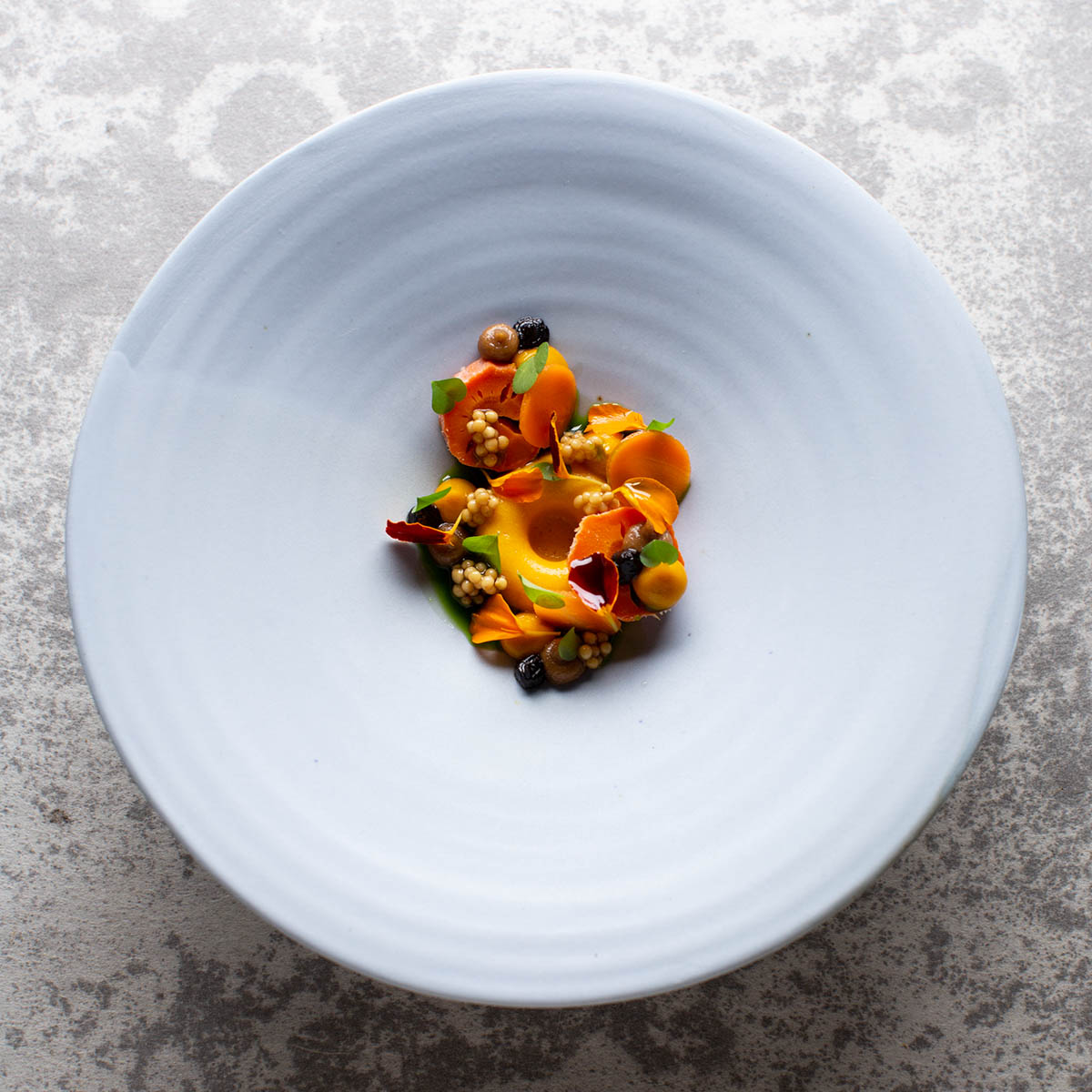 Dass die Knörleins detailverliebt sind, lässt schon die Körperkunst erahnen, die überall auf ihren Körpern hervorblitzt. Auf den Tellern findet sie sich wieder. Alles ist kunstvoll arrangiert und lässt das Auge freudig mitessen. So auch bei der Karotte in verschiedenen Konsistenzen, angegossen mit Amasake und verfeinert mit Tagetes, die dem Gang einen wunderbar würzig-pfeffrigen Geschmack verleiht.