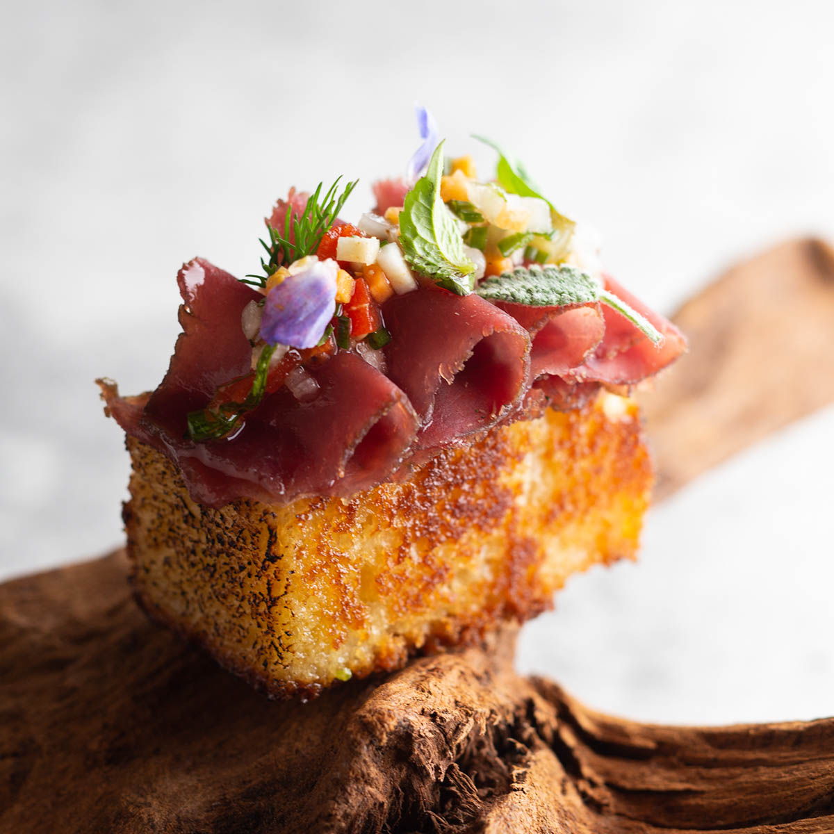 Ganz gleich wie viele Gänge man wählt, ein „Mise en bouche“, eine kleine Brotzeit, die „Salty Tea Time“ und am Ende Petit Fours gehören immer dazu. Doch von vorn … Zu einem Berlin Mule mit Mampe Wodka, Spicy Ginger und Minze serviert Daniela Knörlein den Gruß des Kochs, ein winziges zartes Tartelette mit fein geschnittenem Wagyu Beef und Apfel, begleitet von einem Langos en minature. Ein gelungener Auftakt, der Gutes verheißt.