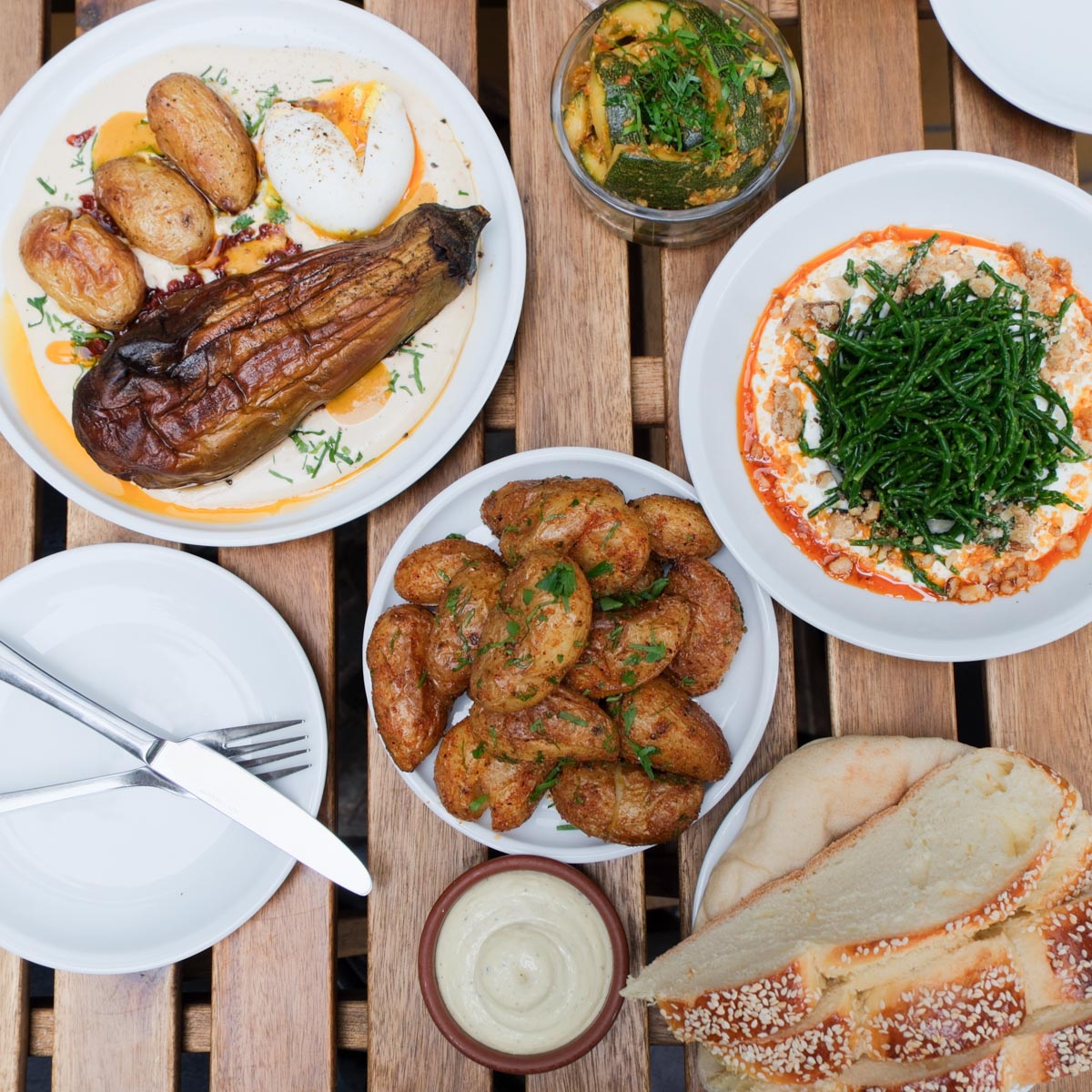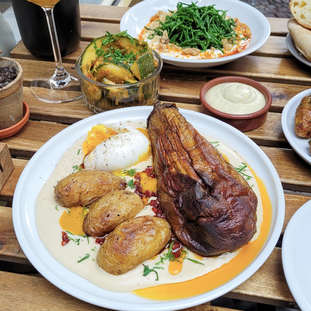 Während uns klassischerweise die Shakshuka anlacht, empfiehlt uns Restaurantleiter Dimitris die „Sabich Plate“. Empfehlungen schlagen wir selten aus und sind sehr angetan vom Resultat. Eine ganze geröstete Aubergine, mit einem weichgekochten Bio-Ei, Tahin, Kartoffeln, Harissa und einer Sauce aus eingelegte Mangos, erfreut das Auge wie den Gaumen.