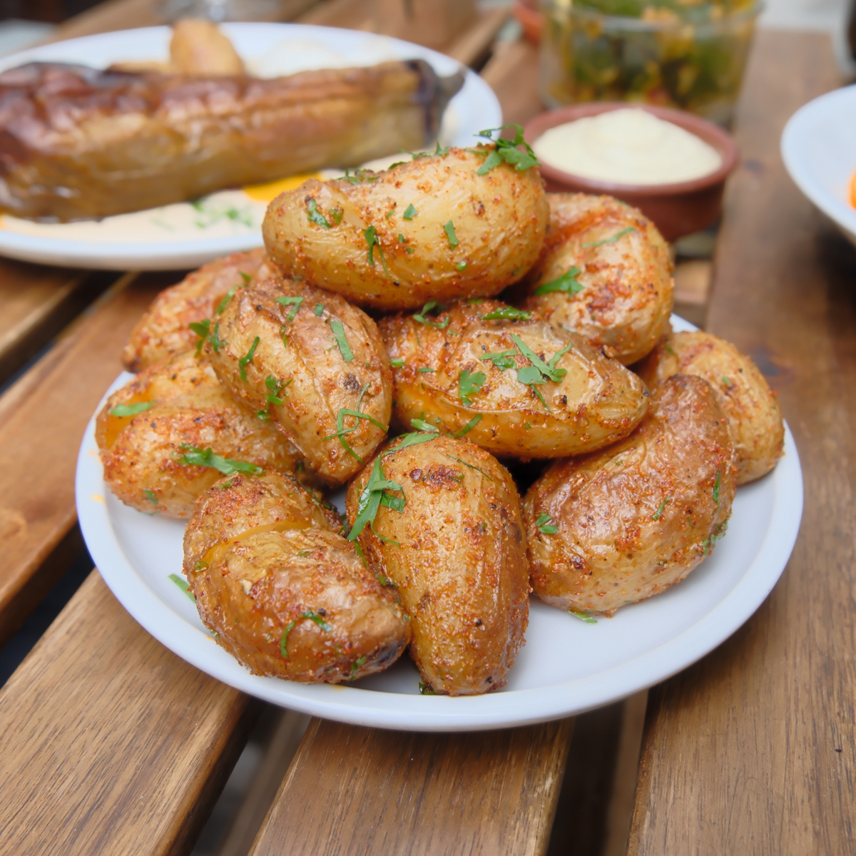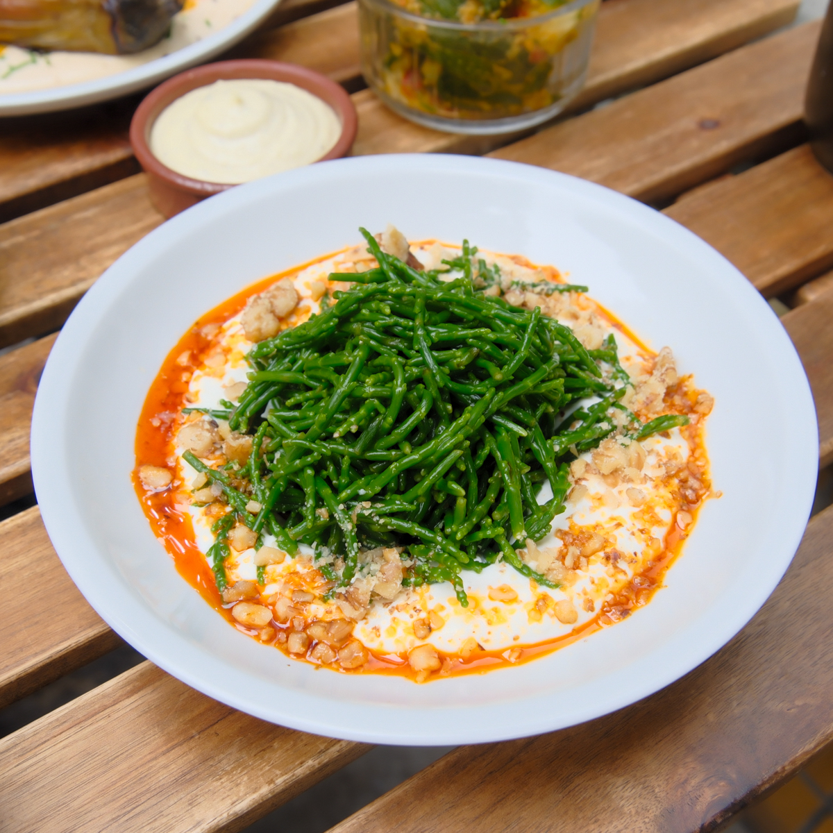 Begleitet von spritzigen und nicht zu knapp dosierten Mimosas lassen wir uns dazu „Drillinge“ schmecken, herrlich gewürzte Ofenkartoffeln, dazu fermentierte Zucchini. Ebenfalls kosten wir eine Neuheit auf der Karte: Seespargel auf Knoblauch-Tahin Joghurt, mit Öl aus roter Paprika und Walnüssen. Wer es nicht kennt: Seespargel ist eine dünne, wie grüner Spargel aussehende Alge, die frisch, knackig und leicht salzig schmeckt. Eine gelungene Kombi.