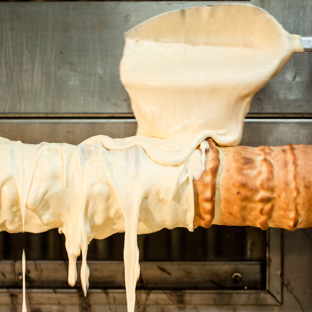 Bei Rabien ist das anders. Dank des separat untergeschlagenen Eischnees sind sie ganz wunderbar luftig und saftig. Kelle für Kelle wird der dickflüssige Teig an einer von Klaus Rabien im Jahr 1970 eigens konstruierten Baumkuchen Maschine von Hand einzeln übergossen und abgebacken.