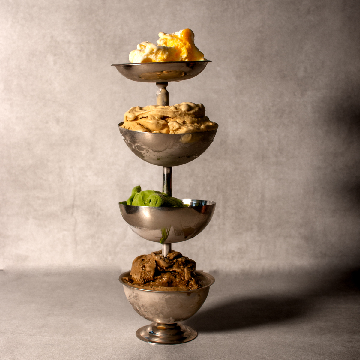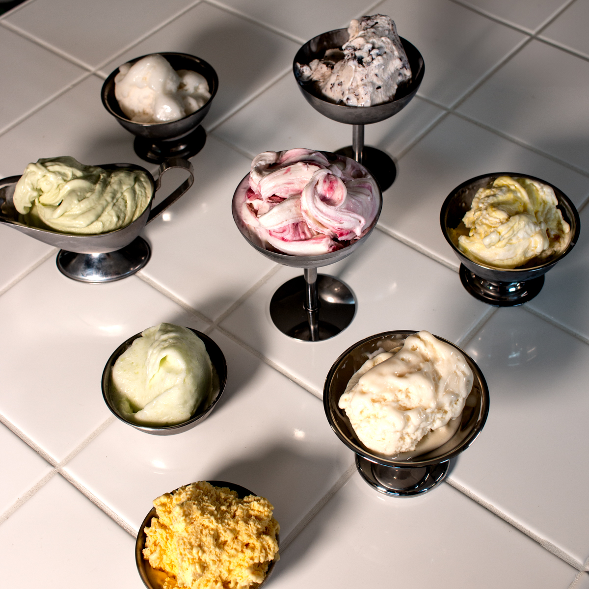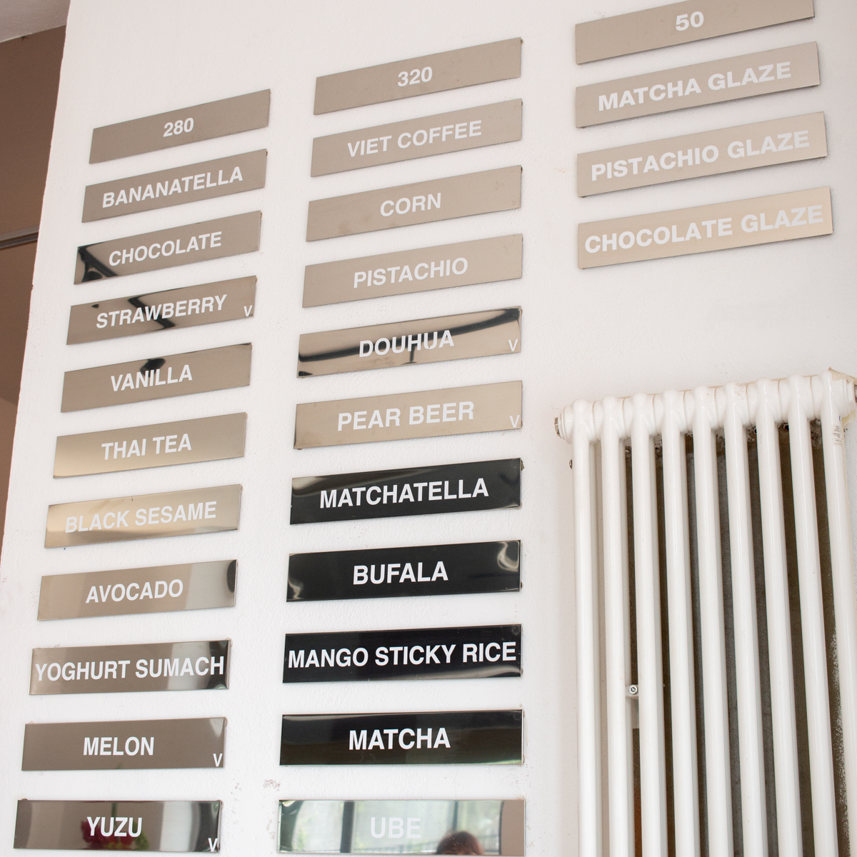 Weil es unglaublich schwer ist, sich bei der großen Auswahl für nur ein, zwei Sorten zu entscheiden – auch „Ube“ (eine violette Yamswurzel) und „Pear Beer“ machen wirklich neugierig –, probieren wir gleich sieben. Und um es gleich vorwegzunehmen: Jede einzelne ist fantastisch. Nur aufgrund persönlicher Vorlieben werden am Ende das Yuzu-Sorbet und „Bufala“, ein Gelato aus herber Büffelmilch, à la minute getoppt mit Salz und Olivenöl, zu unseren Favoriten.