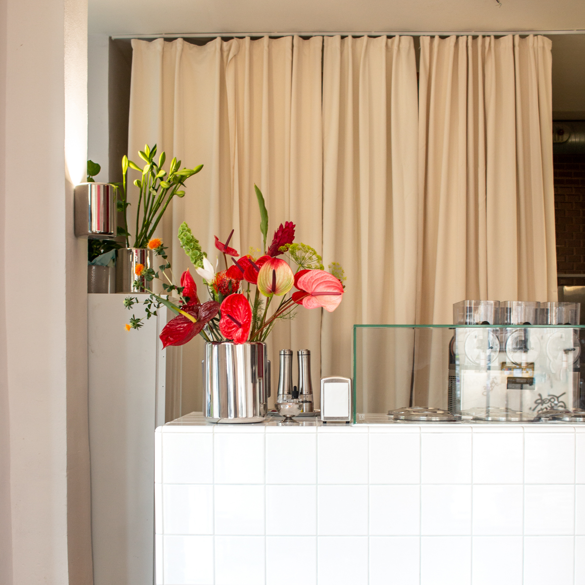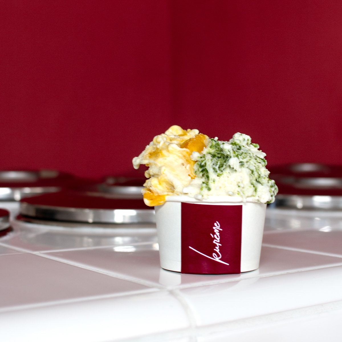 Das Interieur von Kuréme ist puristisch und cool. Knallrot und Weiß. Fliesen, Edelstahl – that’s it. Direkt hinter dem Tresen: die Produktion. An einer Wand die Sorten des Tages, darunter so Spannendes wie „Joghurt Sumach“, „Viet Coffee“ oder „Douhua“, die Interpretation eines chinesischen Desserts aus Seidentofu. Dazu Klassiker wie Schokolade oder Pistazie. – Es liest sich wie eine kulinarische Reise durch die ganze Welt.
