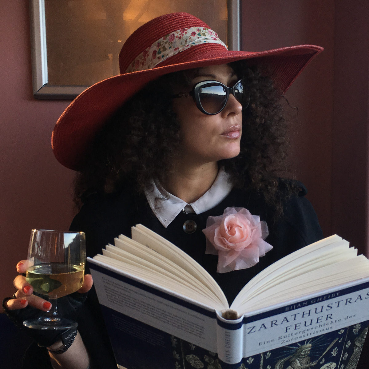 In ihrem langen Blumenkleid nebst Sonnenhut mit breiter Krempe und ihrem Chihuahua auf dem Schoß wirkt sie in dem Sessel der jüngst neu eröffneten Bar des Hauses beinahe ein wenig surreal. Das Sonnenlicht fällt diffus durch die leicht geöffneten schweren Vorhänge und taucht den Raum in ein beinahe mysteriöses Licht.
