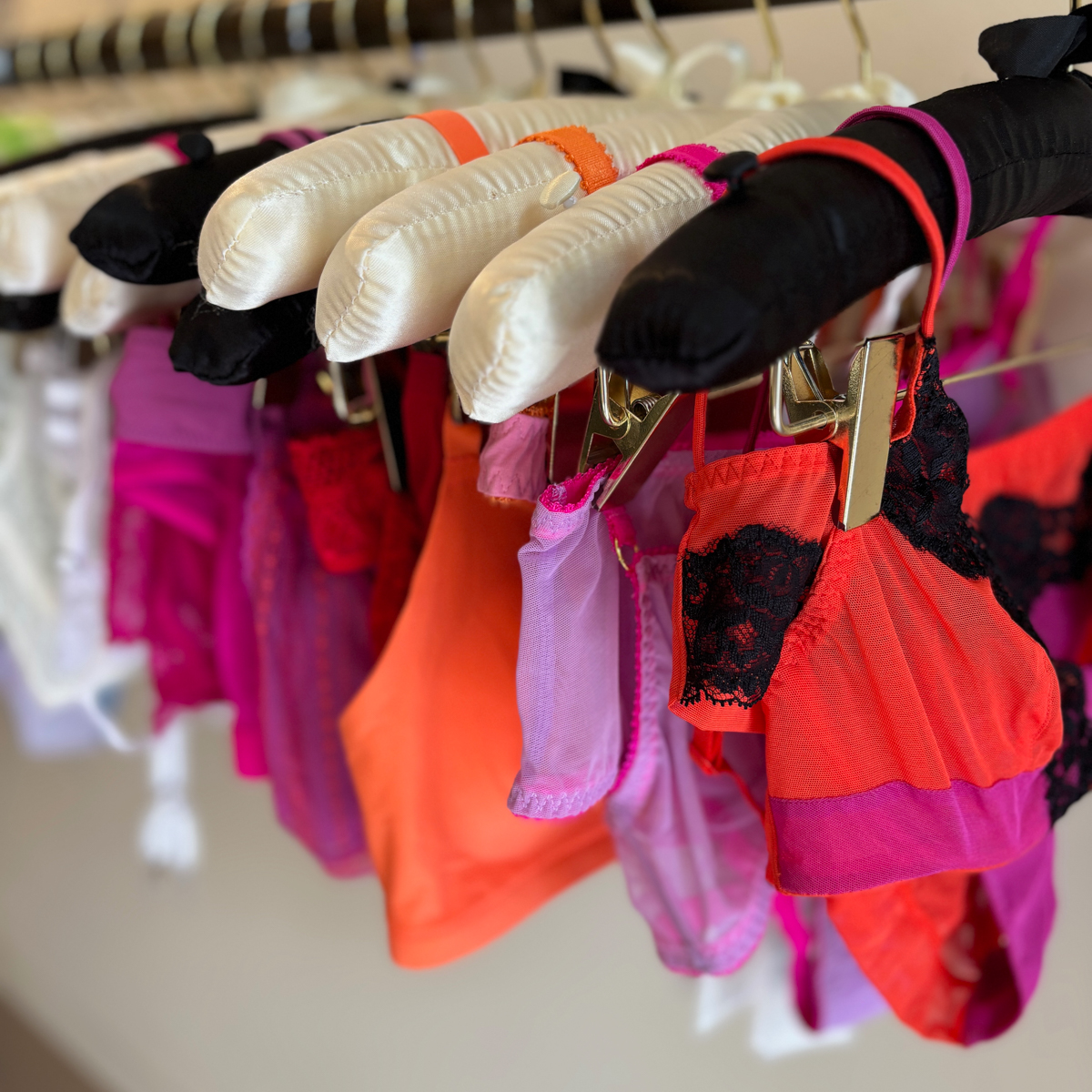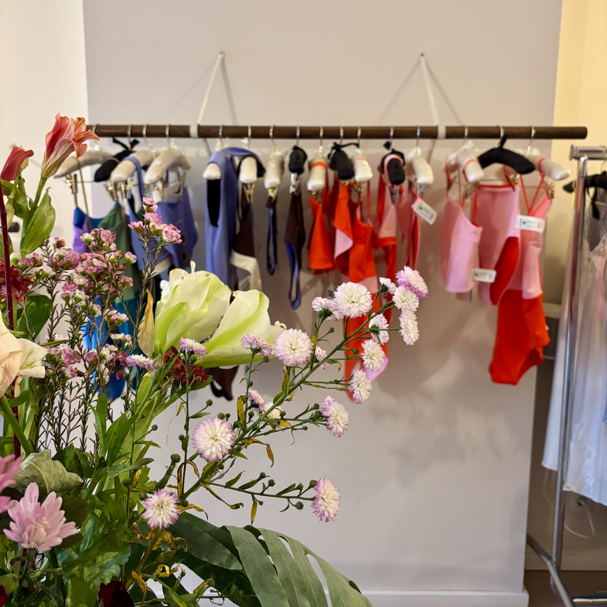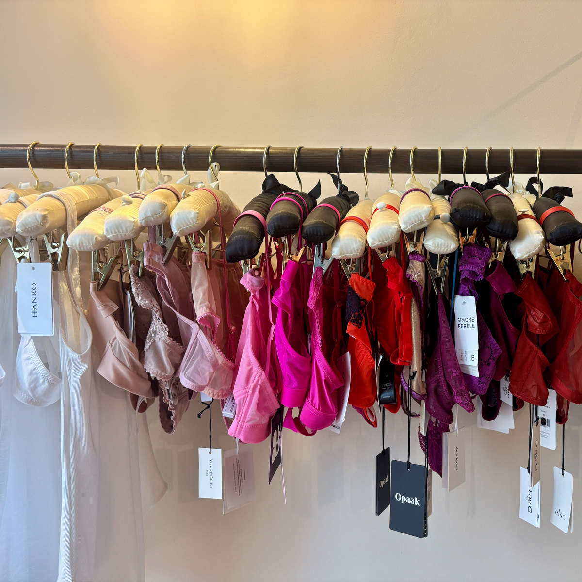 Die zum Teil verspielten, zum Teil minimalistischen Kollektionen von kleinen Labels, die größtenteils nachhaltig produzieren, hängen feinsäuberlich aufgereiht an dunkel gebeizten Holzstangen und laden zum Stöbern ein. Auf seidenen Kleiderbügeln buhlen zarte BHs und Höschen mit klassischen Hemdchen aus feinem Baumwollripp um die Aufmerksamkeit der Kundinnen.