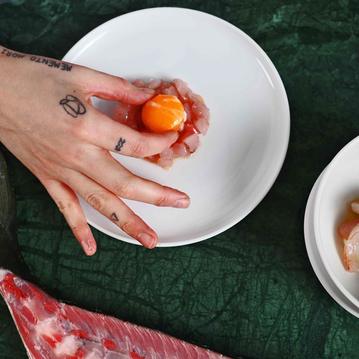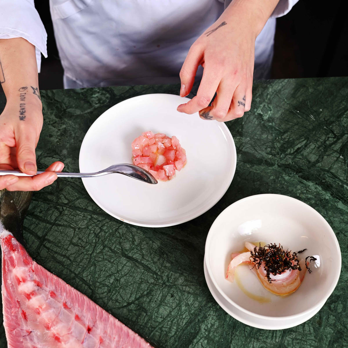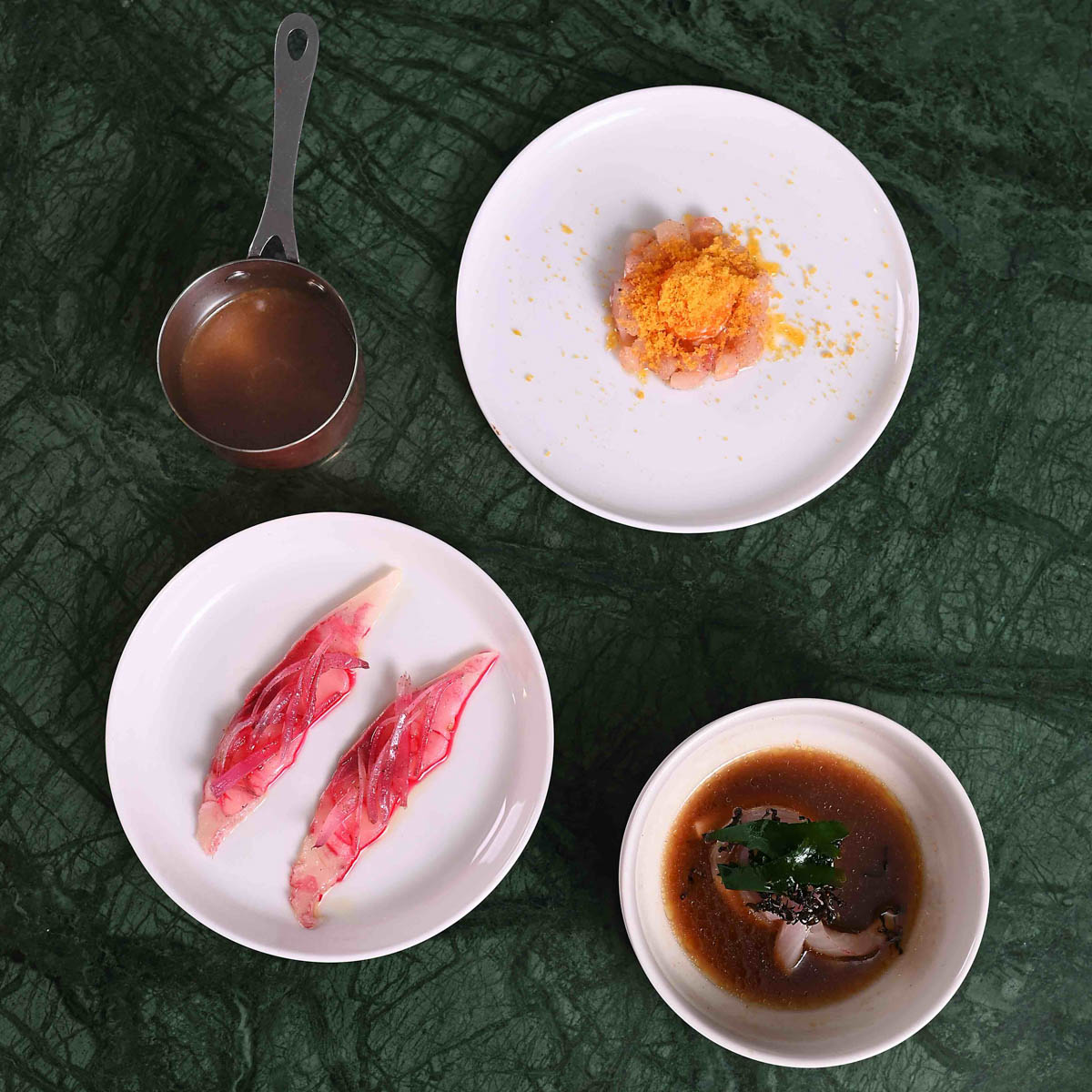 Die frischen Zutaten – vor allem Fisch, aber gelegentlich auch mal Fleisch und natürlich Gemüse – werden puristisch mit den Aromen der italienischen Küche verfeinert. Die einzelnen Gänge können dabei frei kombiniert werden. Mal nur als Begleiter zu einem Glas Wein, Sake oder einem Cocktail, mal zum Lunch oder zum Fine Dining am Abend als vollständiges Omakase-Menü.