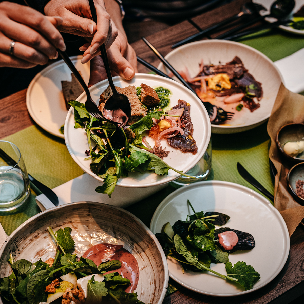 Gut, dass für etwas Süßes trotzdem immer noch Platz ist. Denn so kommen wir zum Abschluss noch in den Genuss einer Panna Cotta ähnlichen Jasmin Tee Creme mit Louisa-Sirup, Birnen und Pistazien. Wenig süß und mit zartem Teearoma kommt dieses Dessert daher. Ein schöner Abschluss für ein nahrhaftes Menü. Unser Rat: Bringen Sie Appetit mit!