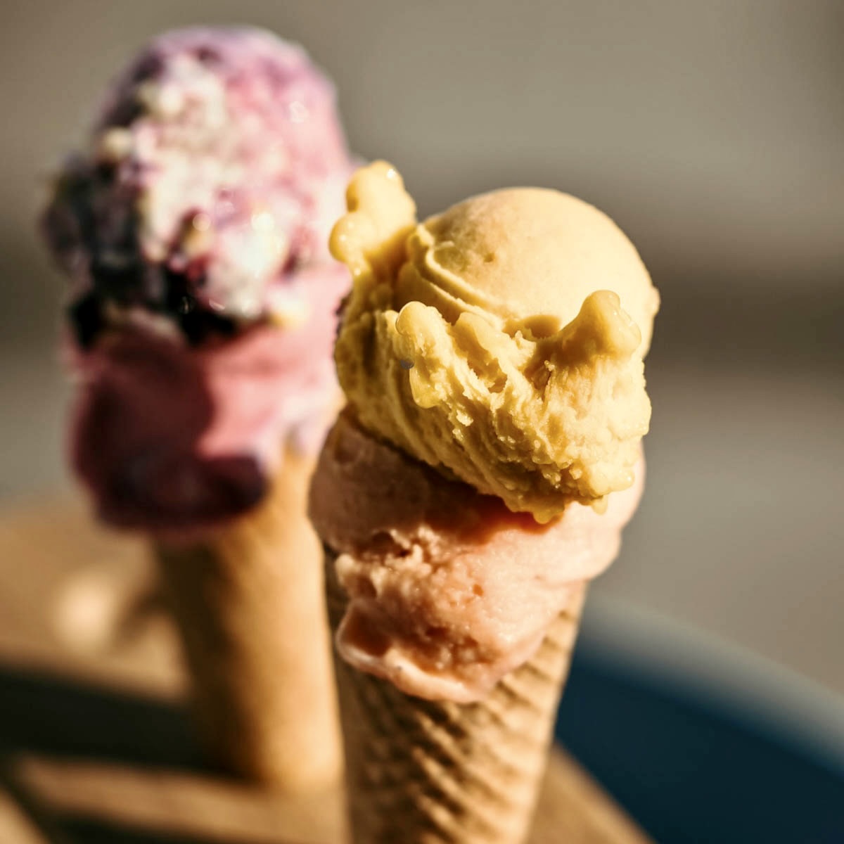 Die Sorten lesen sich abwechslungsreich: Lemoncurd & Italian Meringue, Honeycomb & Salted Caramel, aber auch Spaghettieis oder Gin & Tonic Sorbet. Wir entscheiden uns für Blueberry-Cheesecake, mit echten Kuchenstückchen, sowie Milchreis mit Zimt und Zucker, auch in Eisform ein nostalgisches Gedicht. Das Ganze natürlich in einer Waffel mit Schoko-Streusel Rand. Wenn schon, denn schon.