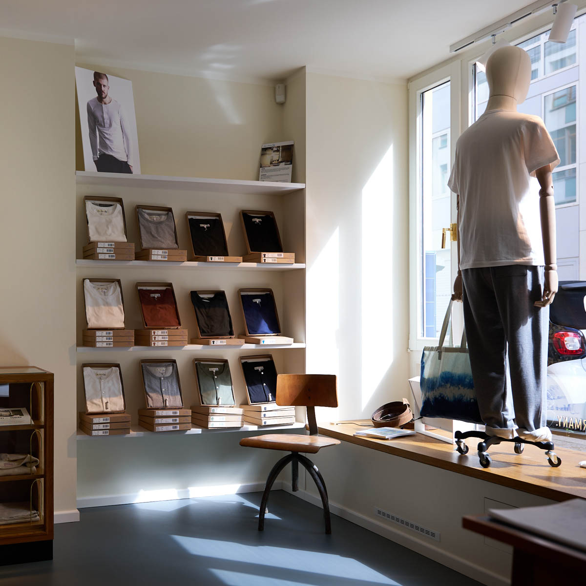 In Berlin hat Merz b. Schwanen seinen Flagship Store. Man findet ihn in der Gormannstraße 25 in Mitte. Hier können nahezu alle Kollektionsteile direkt vor Ort probiert und natürlich auch erworben werden. Eine Yves Klein blaue Ladenfront weist den Weg in den minimalistisch eingerichteten Store. Sie können ihn nicht verfehlen. Versprochen!