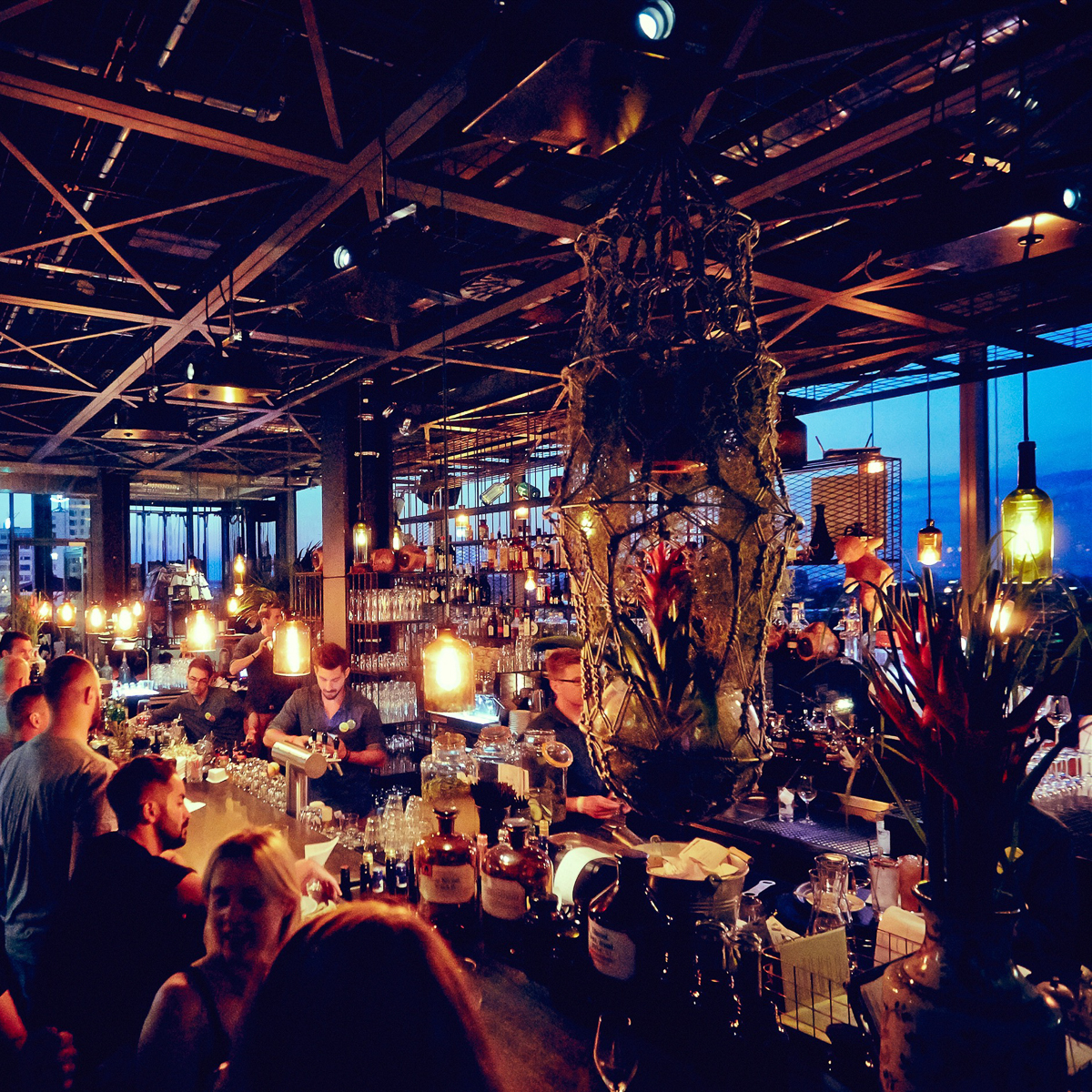 Innen beeindruckt die Monkey Bar nicht nur mit seinem Panoramablick durch die bodentiefe Glasfront, sondern durch viele liebevoll-ironische Details, die einen Mix aus Fabriketage und Dschungel schaffen. So blickt auf die Barkeeper beispielsweise ein lebensgroßes schwarzes Gorillarelief hinab und ums Eck schauen einen neugierig auf die Wand gezeichnete Giraffen an.