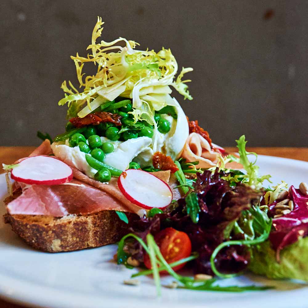 Und das wunderbare Sauerteig-Brot aus Dinkel und Weizen, das hier im Grunde bei jedem Gericht irgendeine Rolle spielt, wird sogar kurzerhand selbst gebacken. Ein Aufwand der sich lohnt, wie wir umgehend feststellen, als uns zunächst ein "Henriks" mit Büffel-Mozzarella, Serrano-Schinken, Zuckerschoten, Erbsen sowie getrockneten Tomaten und Parmesan erreicht.