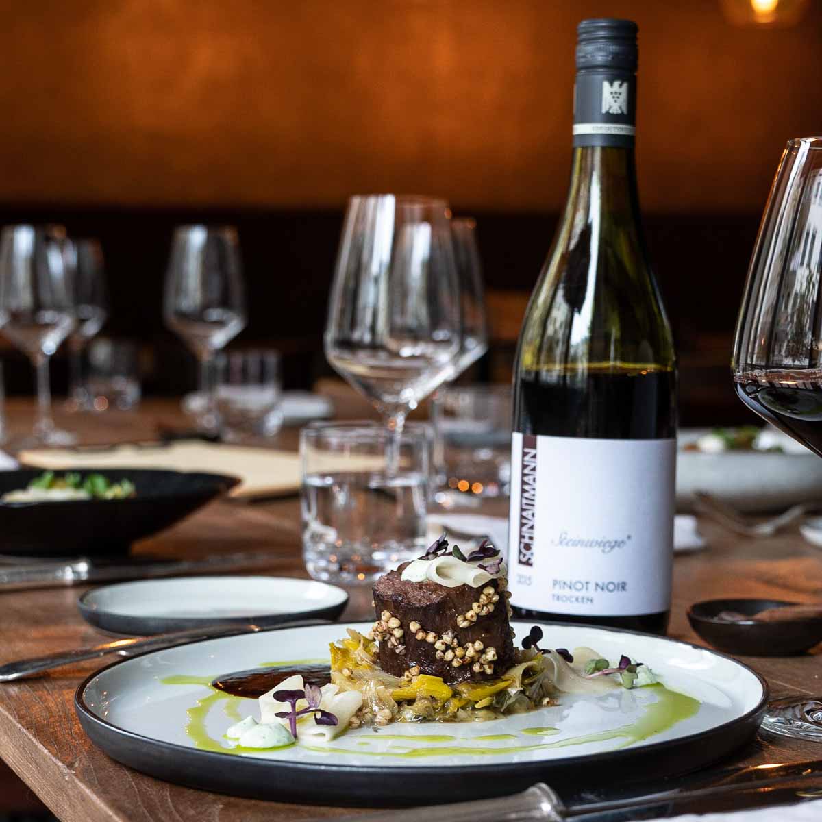Der "Pulpo" mit Kohlrabipüree, Stachelbeere und Salzzitrone sowie das "Rinderfilet" mit Buchweizen, Mairübe, Porree und einer Kaffeezabaione stehen dem in nichts nach und leiten hervorragend über zu den Hauptgerichten "Spargel" mit Mandel, Miso und Sauerampfer sowie "Maibock" mit Rote Bete, Mispeln, Mascarpone und Walnuss.
