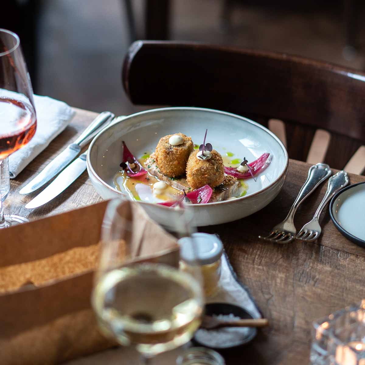 Im Neumond Restaurant kreiert der 40jährige nun seine ganz eigene Küche. Der Küchenstil ist in erster Linie saisonal – vor allem aber auch authentisch und instinktiv. Er bringt Einflüsse seiner drei Kulturen mit denen seiner ehemaligen Chefs zusammen und schafft eine Fusion aus Saisonalität und internationalen Einflüssen, die uns während unseres Dinners jubeln lassen, wenn er Spargel mit Miso, Pulpo mit Stachelbeeren oder Lachs mit Wasabi zusammenbringt.