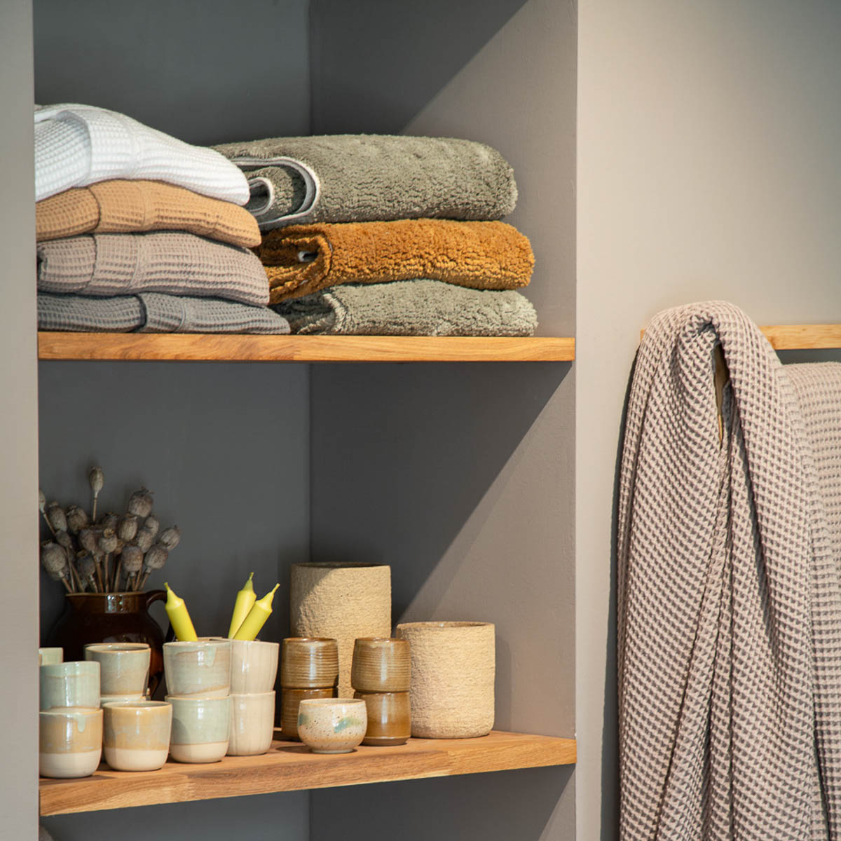 Dass die 36-Jährige ein Faible für den mediterranen Lebensstil hat, ist unübersehbar. Ihre Heimtextilien wie Bademäntel und Handtuchsets aus Waffelpiqué, kuschelige Frotteebademäntel, Badvorleger und klassische Bettwäschesets spiegeln ebenjene Farb- und Materialwelt. Die Stoffe sind zum Teil bereits farbig gewachsen, wodurch zarte natürliche Pastelltöne entstehen.