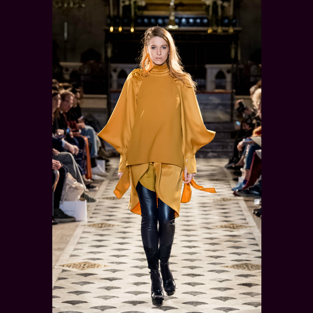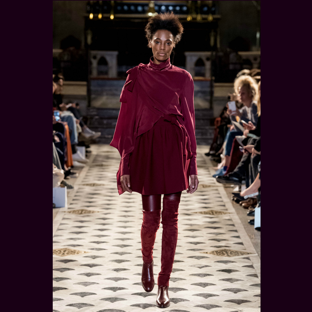 Haushohe Wände, die mit vielen bunten Fenstergläsern verziert sind. Prächtige Säulen, die den weiten Raum der Kathedrale teilen. Dunkelbraune Kirchenbänke fungieren als Front- und Second-Row. Gigantische Scheinwerfer beleuchten den schwarz-weiß gefliesten Kirchenboden, der an diesem Tag der Laufsteg ist. Es ist das zweite Mal, dass die Designerin Nobieh Talaei auf der Paris Fashion Week dabei ist – bereits im September 2016 debütierte das Label in der französischen Hauptstadt.