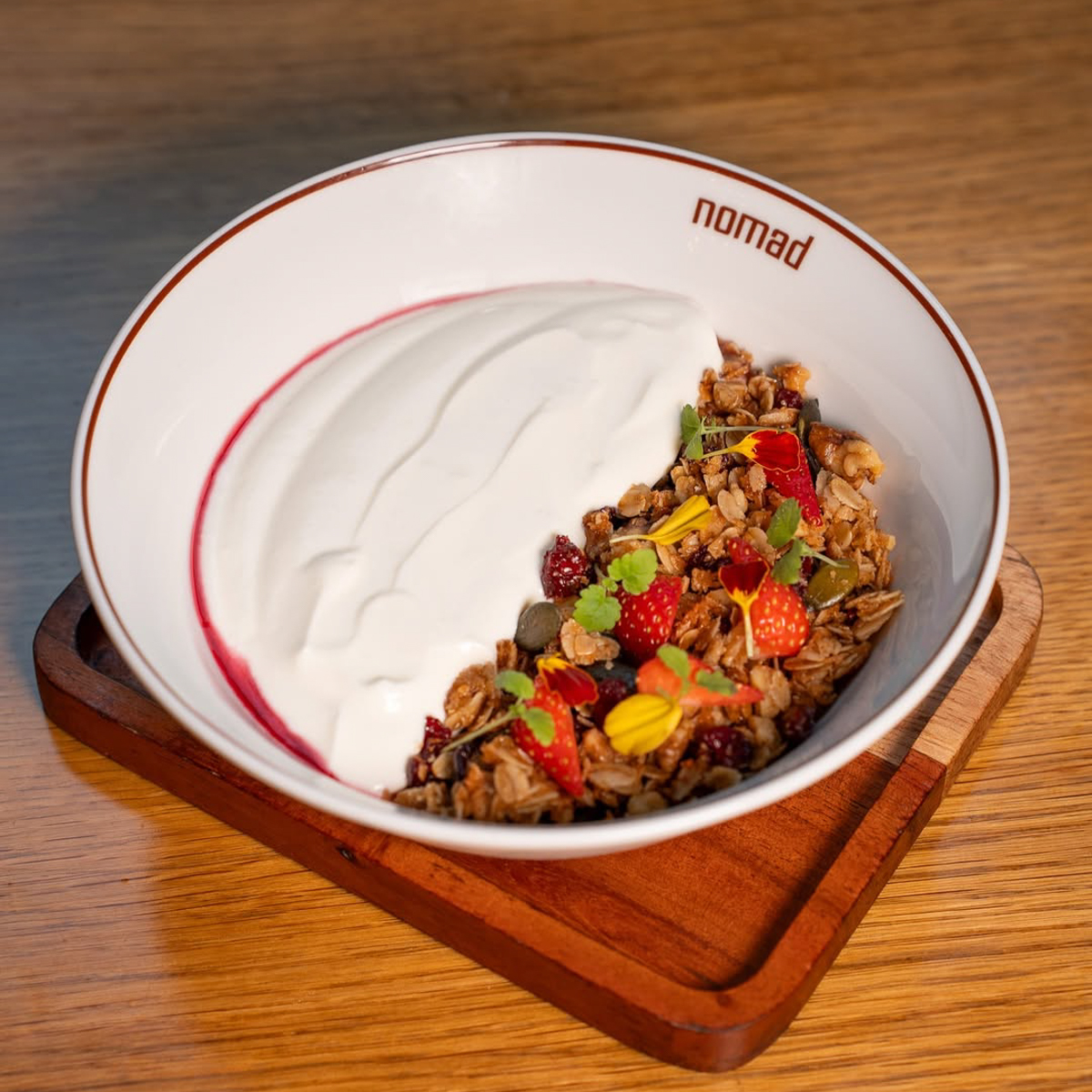Die Karte ist übersichtlich und liest sich wie das Who’s Who der Berliner Brunch-Szene. Doch selbst bei Klassikern wie hausgemachtem Granola, Eggs Benedict oder Pancakes überrascht die Küche des Nomade immer mit einem spannenden Twist und besonderen Aromen.