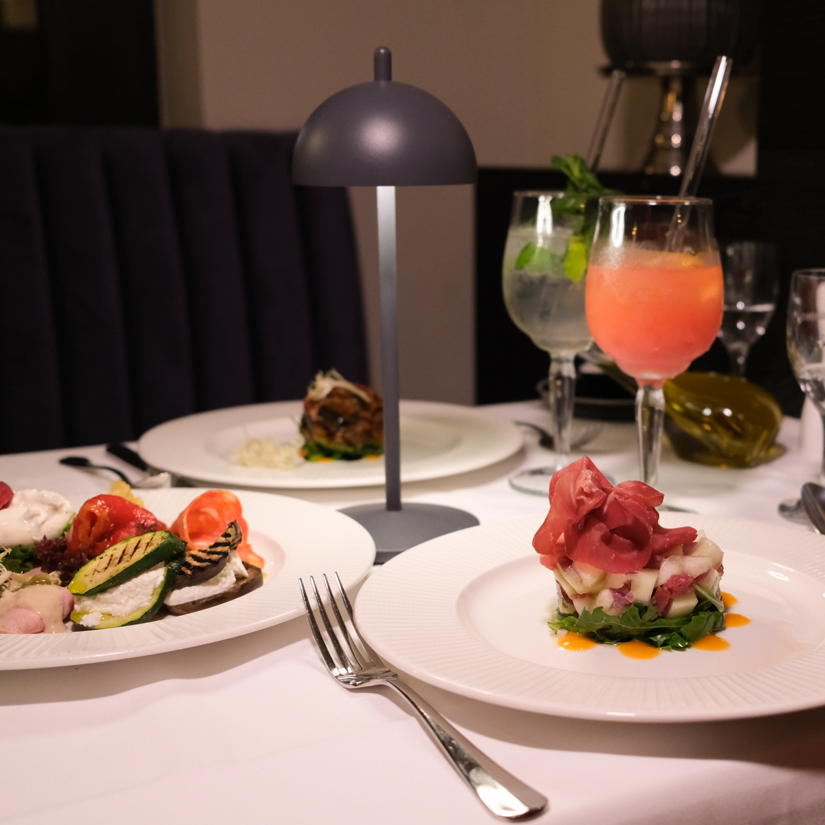 Die Klassiker auf unserer Vorspeisenplatte schmecken genauso, wie man sich das beim „Italiener um die Ecke“ wünscht – angefangen mit den Calamaretti auf Rucolasalat über das Vitello Tonnato bis hin zum marinierten Lachs und der schlozigen, nicht zu süßen Caponata. Dazu wird gerne etwas Prickelndes getrunken oder auch alkoholfreie Longdrinks serviert. Eine solide feine Weinauswahl gibt’s natürlich auch.