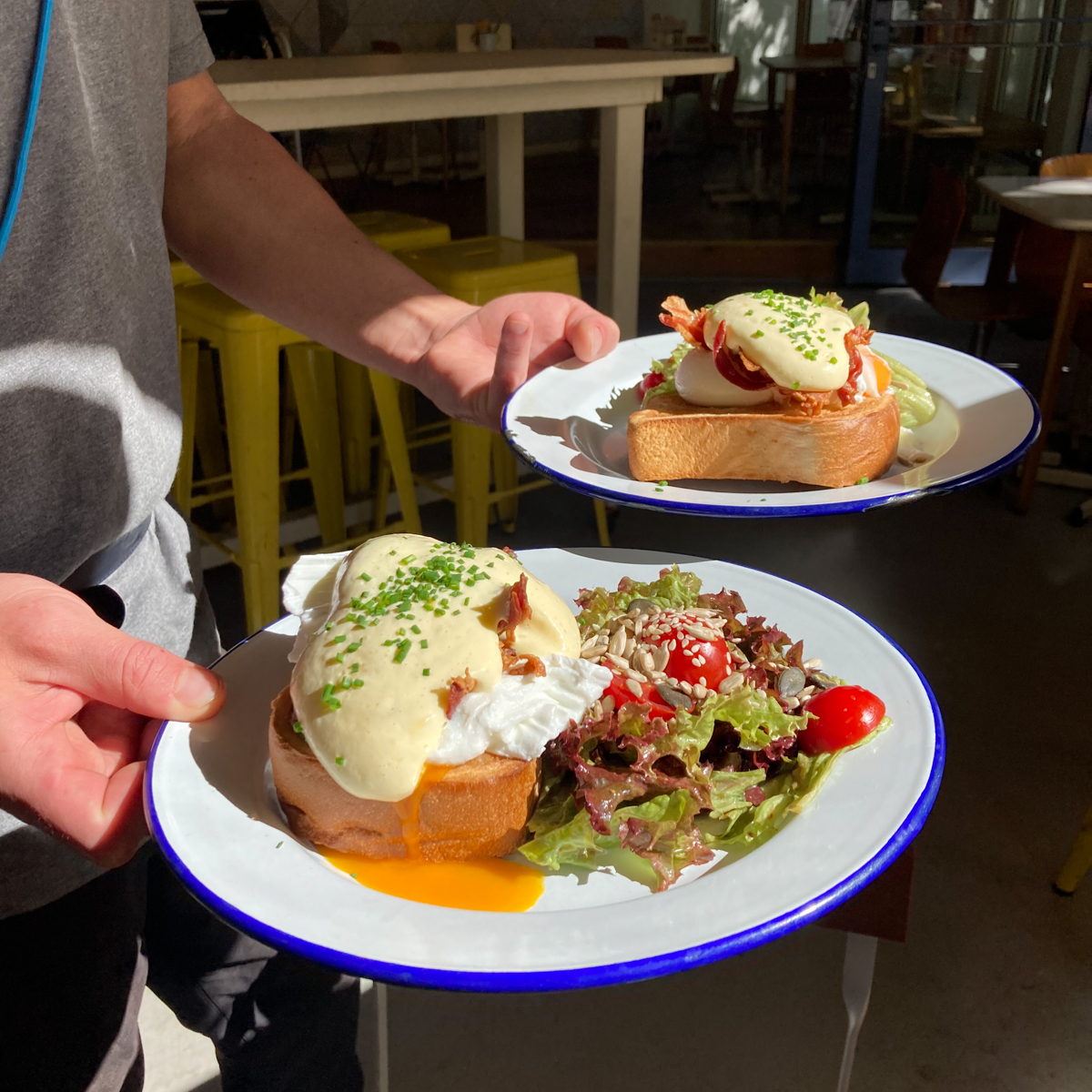 Strahlend leuchten einem die fröhlich-gelben Schirme und Tische des Frühstückscafés Oeuf am Nettelbeckenplatz im Wedding entgegen. Dabei symbolisiert die Sonnenfarbe hier nicht nur Frohsinn und Leichtigkeit, sondern auch das hier definitiv nicht bloß sprichwörtlich zu verstehende Gelbe vom Ei. Immerhin trägt das süße Brunchcafé letzteres bereist im Namen: Oeuf - französisch für Ei.