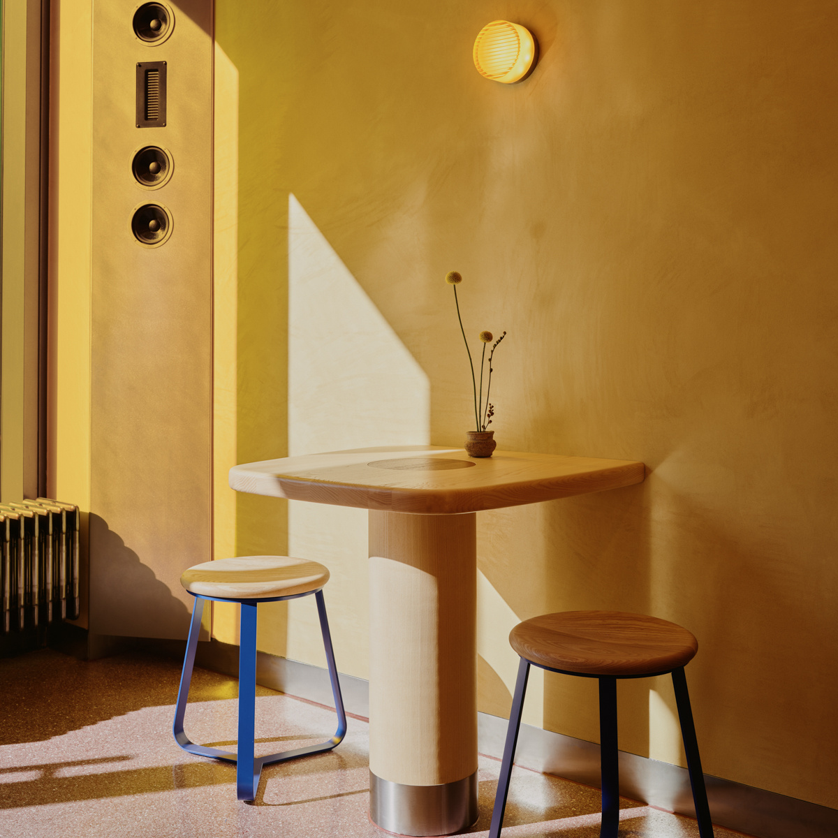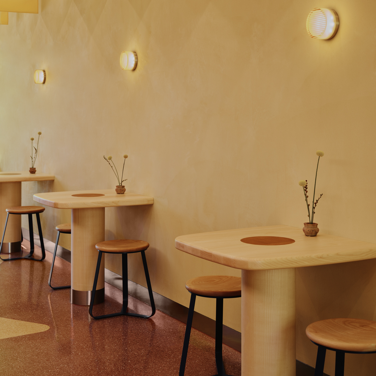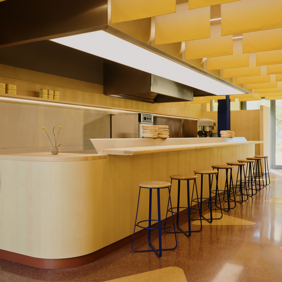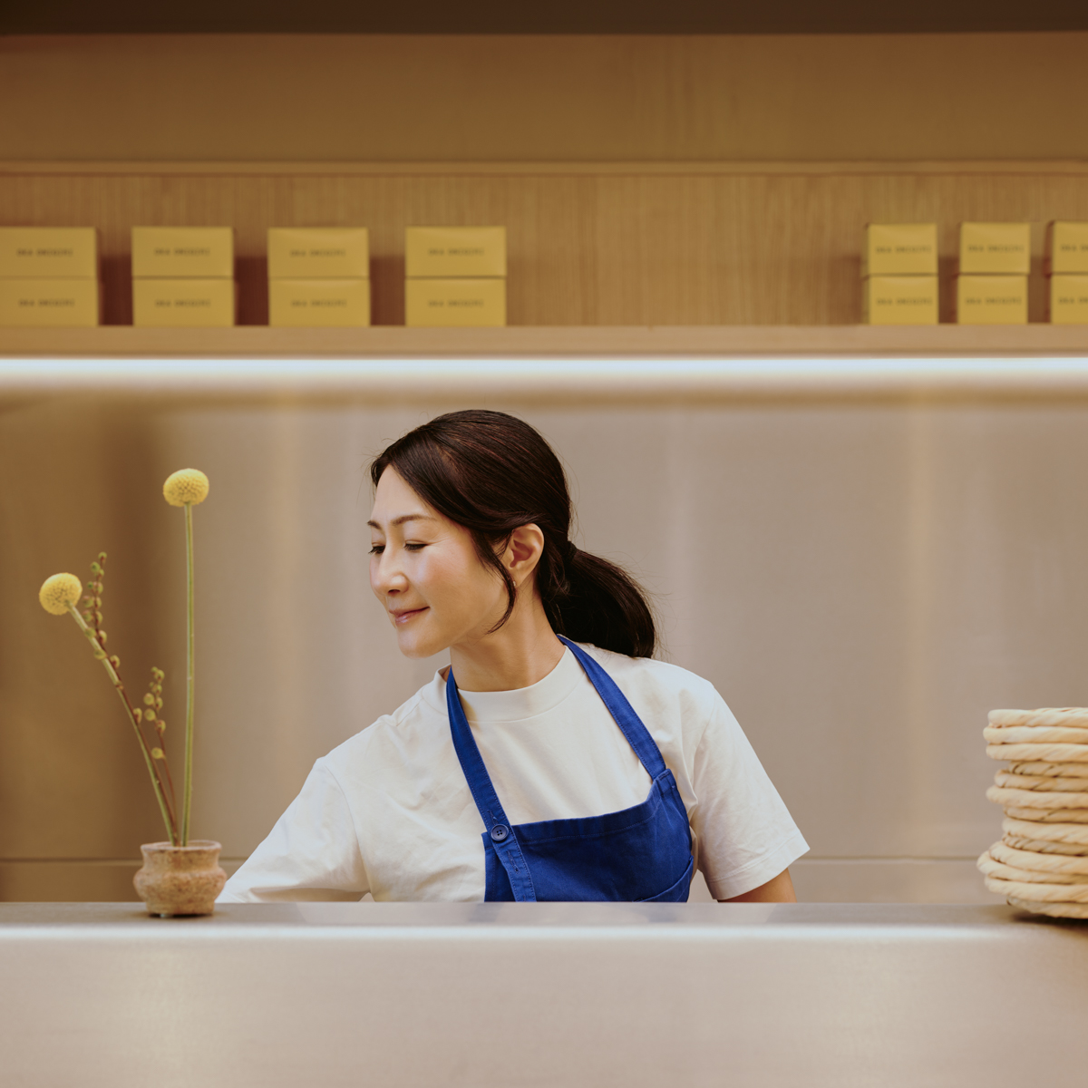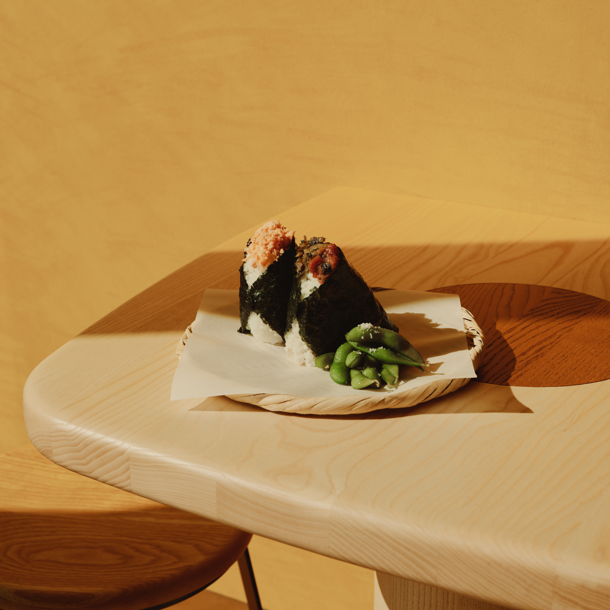 OKA ist Essenz – reduziert, klar, liebevoll bis ins kleinste Detail. Selbst die Verpackung hat Kaoru Iriyama millimetergenau konzipiert. Das Interieur wurde vom Londoner Designbüro Child Studio realisiert. Ruhige Farben und weiche Formen, die an die Onigiri erinnern, sorgen für meditative Stimmung, trotz der Größe des Raums. Küche und Sitzplätze sind eins. Von der Decke hängen Stoffbahnen für eine gute Akustik.