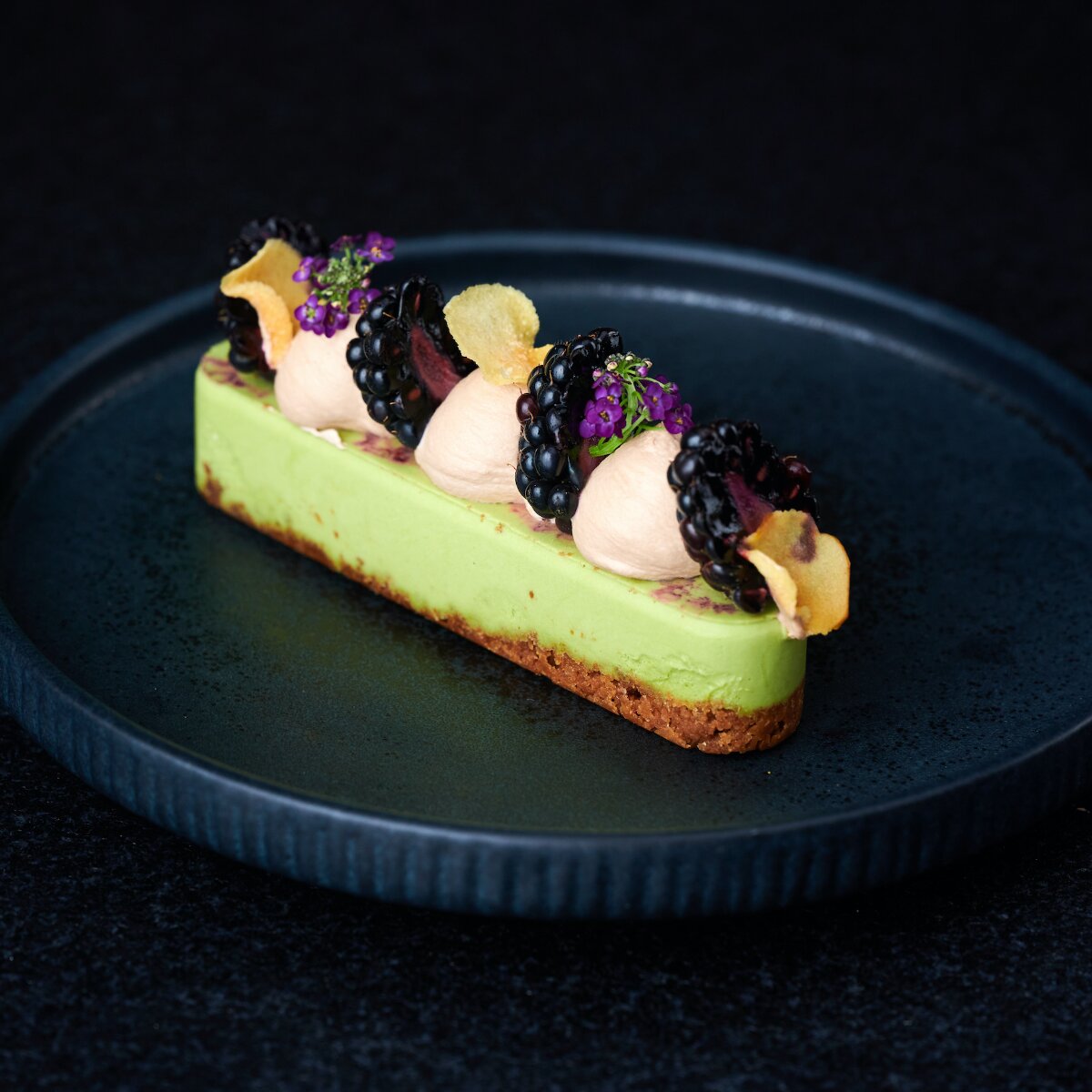 Hebt man moosigen Stein an, verbirgt sich darunter ein Kürbispürre, das Eigelb imitiert – stimmt ja, pflanzenbasierte Küche! – gerösteter und eingelegter Blumenkohl ergänzen das Gericht. Sehr gefällt uns auch die in Öl gegarte und gedämpfte Schwarzwurzel mit Paprikasauce und Pak Choi. Togarashi, eine japanische Gewürzmischung, verleiht dem Gericht eine erstaunlich durchdringende Schärfe, die der Sencha Coldbrew angenehm auszubalancieren weiß.