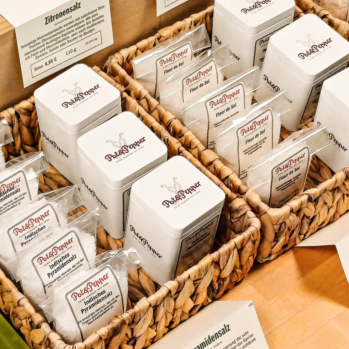 Die Gewürzmischungen stellt er nach eigenem Rezept zusammen. Zitronensalz, knusprige Würze für den Salat, die passenden Mischungen je nach Fleisch- oder Fischgericht und vieles mehr, werden hier in formschöne Behälter abgepackt, ideal zum Verschenken. Natürlich bekommt man bei Pot & Pepper auch alle Grundgewürze einzeln. Alles wird von Hand abgefüllt.