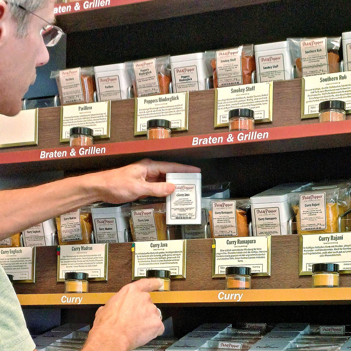 Von Safran bis Szechuan Pfeffer, von Knoblauch bis Kardamom: Bereits seit 19 Jahren verkauft Michael Bär Gewürze und selbstgemachte Gewürzmischungen in seinem Laden Pot & Pepper, inzwischen sind es über 240 verschiedene. Keine Fertigmischungen aus dem Großhandel findet man hier, ebenso wenig wie Geschmacksverstärker. Lediglich die Grundzutaten kauft der passionierte Ladeninhaber, dessen Gewürzliebe, wie könnte es anders sein, aus einer Leidenschaft zum Kochen stammt.