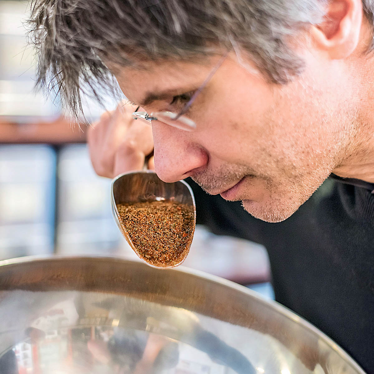 Im Laden sind, gleich einem Teeladen, die Gewürze und Gewürzmischungen feinsäuberlich in edlen Blechdosen und dunklen Apothekenflaschen aufgereiht. Wer da die Wahl hat, hat die Qual, denn ob der Vielfallt fällt die Entscheidung mitunter schwer. Gut, dass Michael Bär beratend zur Seite steht und auch für ganz spezifische Gerichte das Richtige parat hat.