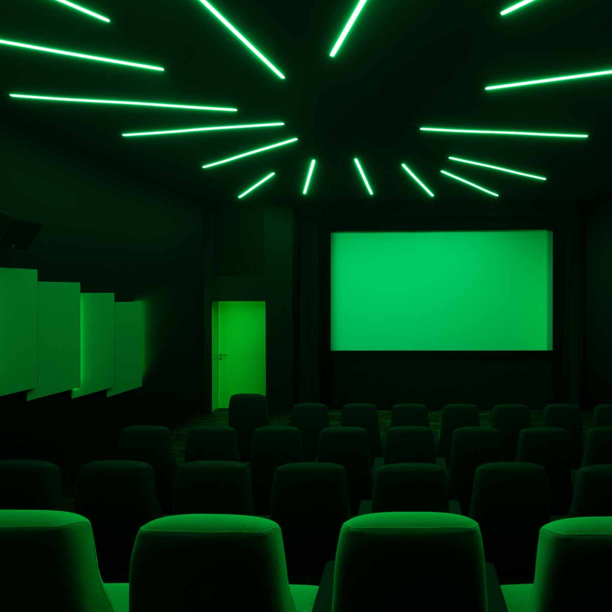 Das Innere der Säle ist in sattes Theaterrot, Pink oder auch Blau getaucht und die Linien wiederholen sich in Form von Lichtstreifen in den Wänden. Besonderer Blickfang ist ein ganz in schwarz gehaltener Saal, der von einem verwinkelten Netz aus Lichtlinien durchzogen wird, die die Grenzen des Raumes aufzulösen scheinen und ihre Farbe beliebig wechseln können.