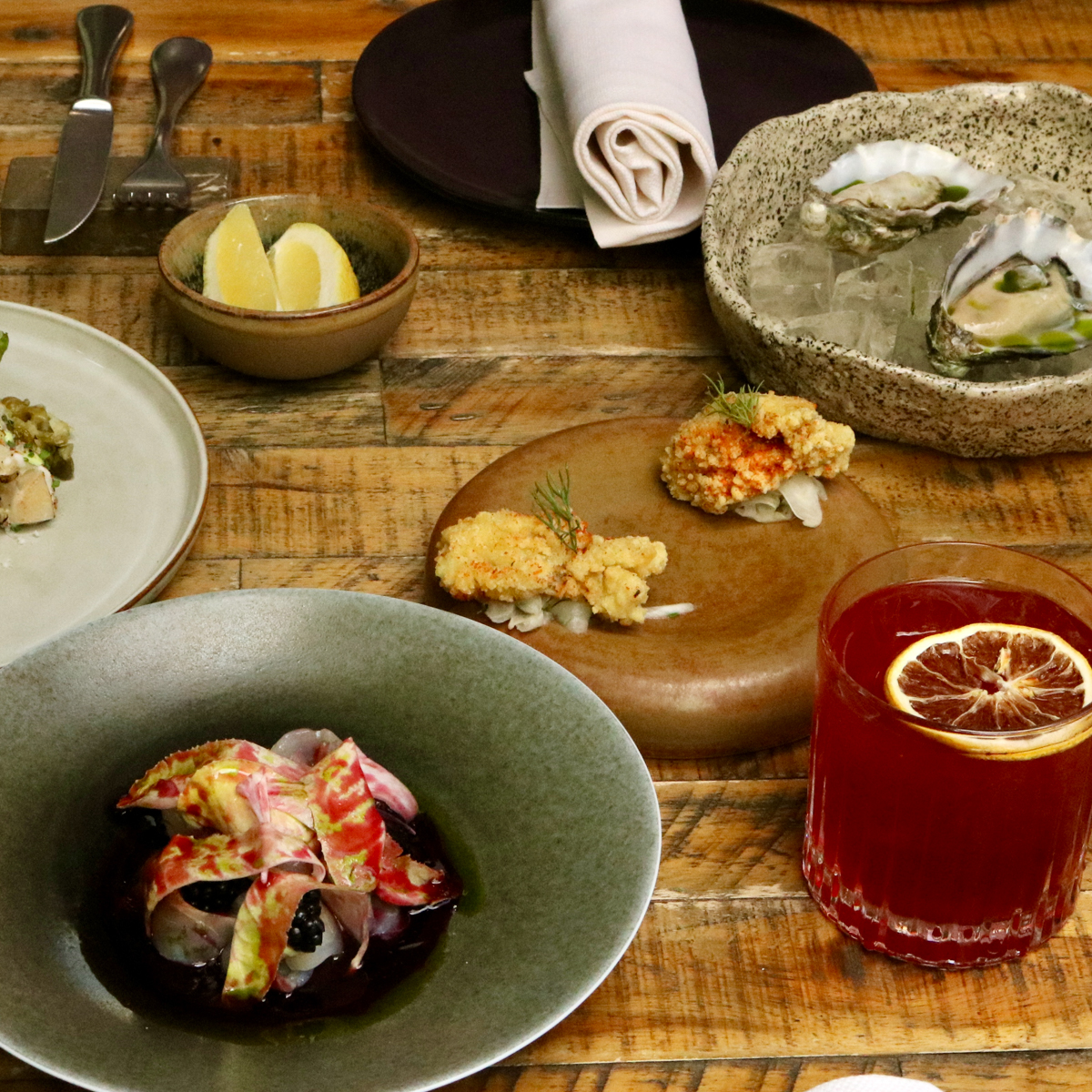 Wir starten mit Domberger Brot nebst Maronenbutter und studieren bei einem Glas „Lunar Herbs“ von Leon Gold aus Württemberg die Karte. Die Buttermilch-Auster als Signature-Dish wird uns besonders ans Herz gelegt. Sie wird in Buttermilch, Fenchelsamen und Tabasco eingelegt, in Tapioka getaucht und frittiert. „Für alle, die eigentlich keine Austern mögen, ist das ideal, um auf den Geschmack zu kommen“, schwärmt Alessandro Francioso. – Recht hat er, wir sind hin und weg!