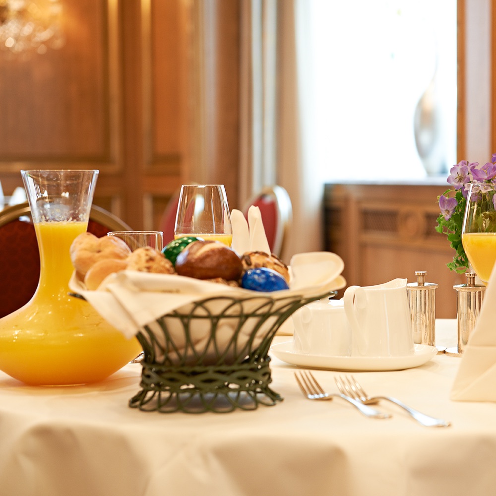 Während Kinder unter Anleitung Eier bemalen und Osterkörbe basteln, werden Erwachsene zunächst mit einem Glas Champagner begrüßt. Später geht es dann ans opulente Buffet, das mit kalten und warmen sowie süßen und herzhaften Köstlichkeiten aufwartet. An zwei Live Cooking Stationen werden vor den Augen der Gäste verschiedene Eierspeisen sowie Pfannkuchen und Waffeln zubereitet; das Vorspeisenbuffet beinhaltet kulinarische Spezialitäten wie Maine Hummer, Fines de claires Austern und gebeizten Fjordlachs; die warmen Speisen reichen von Lammschulter aus dem Rohr über Wachtel bis hin zu Kabeljau. Abgerundet wird der kulinarische Spaziergang durch ein exzellentes Salat-, Käse- und Dessert-Buffet sowie die klassischen Frühstücksspezialitäten.