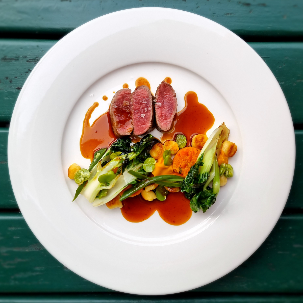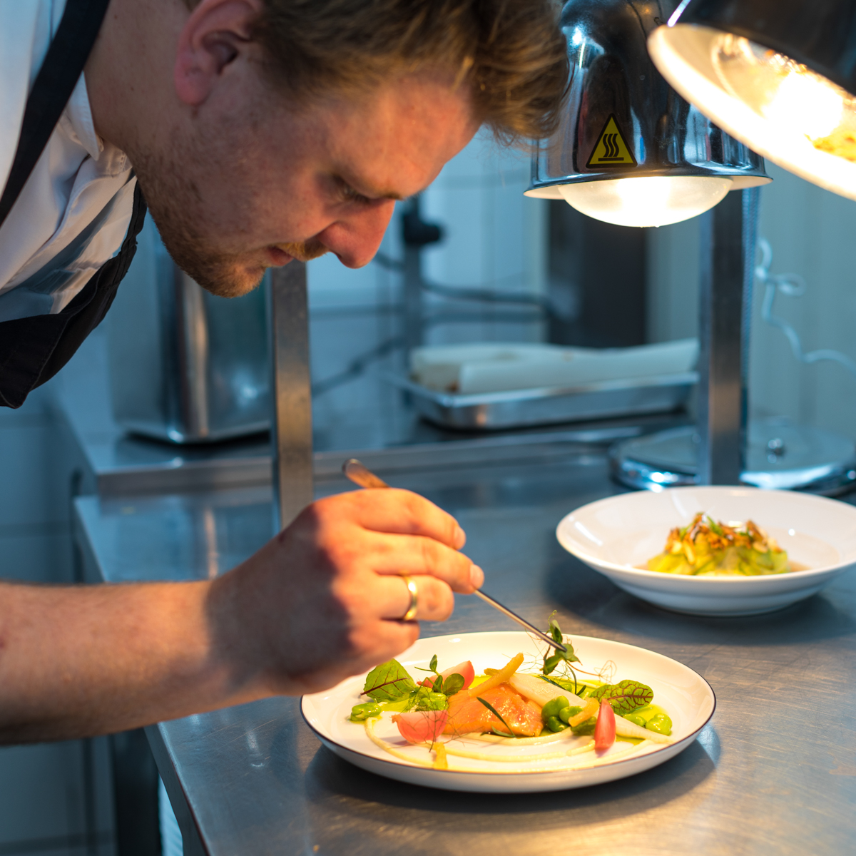 Es beginnt bei den Vorspeisen, etwa dem gebeizten Stör mit geeistem Kerbel, Kohlrabi und einem Hauch Grapefruit – zart, frisch, mit genau dem richtigen Maß an Säure. Wer Fisch liebt, sollte sich aktuell außerdem das Filet vom Ijsselmeer-Zander nicht entgehen lassen, der verfeinert mit Safran nebst Fenchel und Cima di Rapa serviert wird und nicht nur bei uns großartig ankommt.