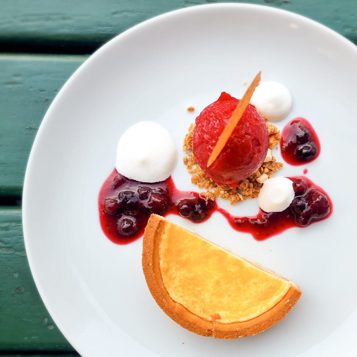 Die Mascarpone-Mandel-Schnitte mit Rhabarber und einer Nocke Himbeersorbet zum Dessert ist leicht und üppig zugleich. Vor allem aber gnadenlos köstlich. Wie eigentlich jeder Gang des heutigen Abends. Doch spätestens jetzt verlieben wir uns in Richard Reichelt, der sein Können einst im Margaux bei Michael Hoffmann verfeinerte und aus dessen ehemaligem Garten er heute sein Gemüse bezieht.