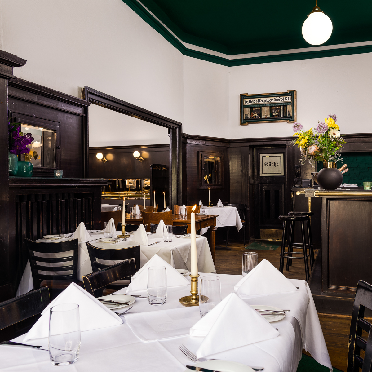 Seit der Wiedereröffnung im Februar 2022 hat Küchenchef und Gastgeber Richard Reichelt hier einen Ort geschaffen, der an Omas Küche erinnert, ohne je ins Nostalgische zu kippen. Vielmehr schlägt er mit modernen, französischen und mediterranen Einflüssen ein neues Kapitel der Berliner Gasthauskultur auf und serviert eine äußerst elegante und doch unkomplizierte Küche.