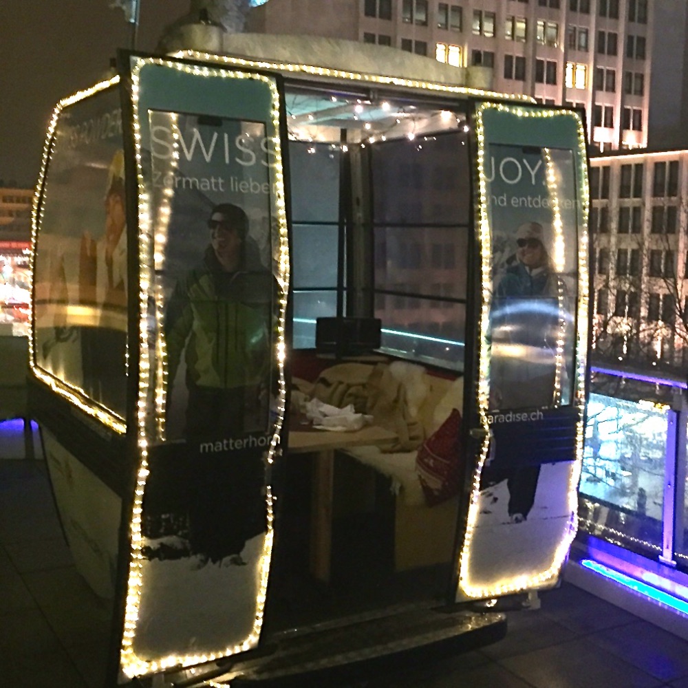 Seit Wochen wollte ich die Gondel oben auf der Terrasse vor dem Restaurant 44 des Swissôtel besuchen. Hoch hinauf zum Matterhorn ist sie einst gefahren und steht nun bereits den dritten Winter mit Blick auf den Ku’damm zum Beisammensein in kleinster Runde bei Käsefondue oder anderer Schweizer Spezialitäten bereit. Gut gebucht, wie dieser Ort ist, war es jedoch gar nicht so einfach eine Reservierung zu bekommen. Nun war es endlich soweit.